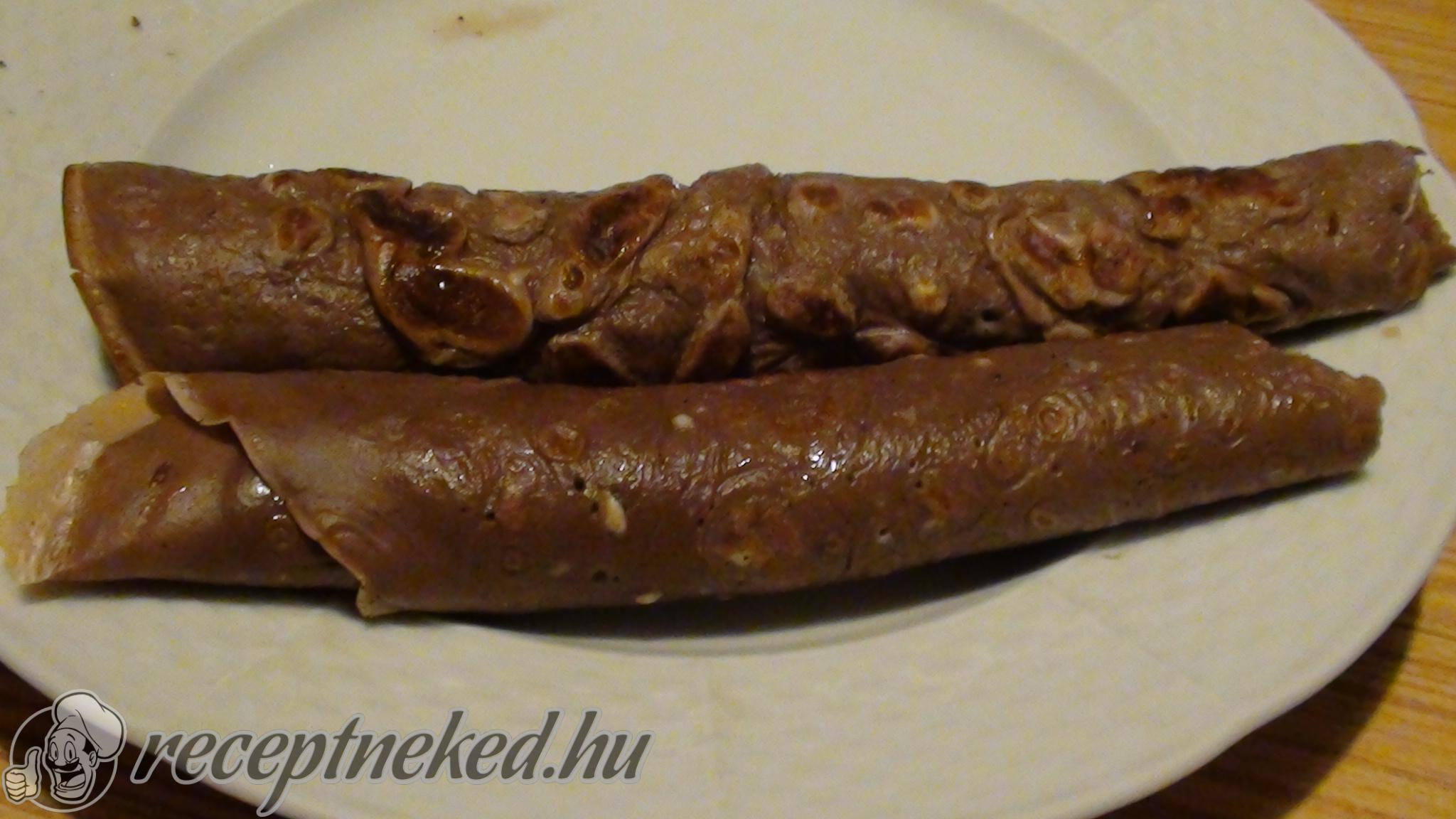 Egy palacsintasütőt vékonyan kiolajozunk, majd a tésztából egyenként kisütjük a palacsintákat.