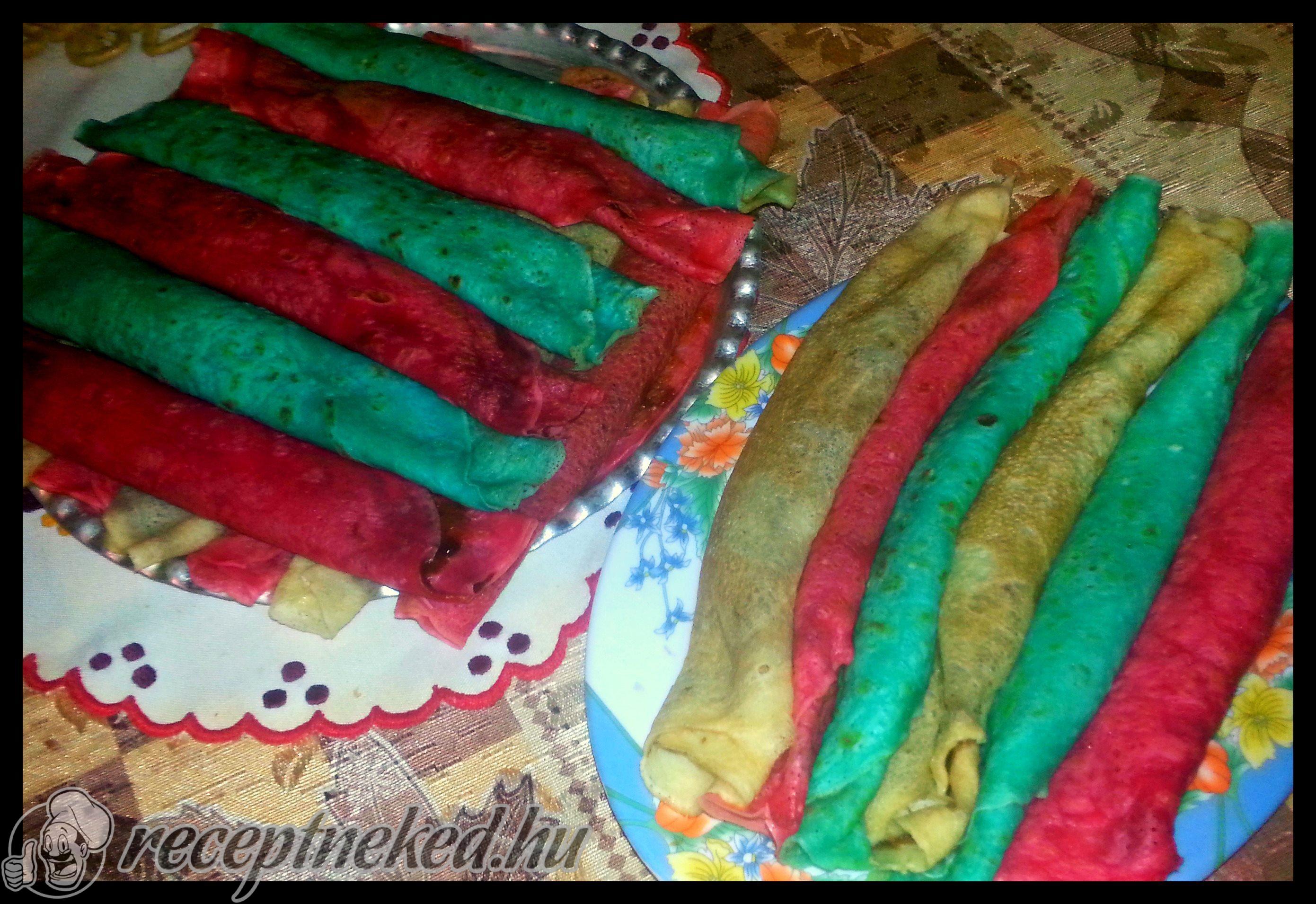 A hozzávalókat összekeverjük, több felé osztjuk, ételszínezéket használunk a kívánt szín eléréséhez. Ezután forró serpenyőben kisütjük.