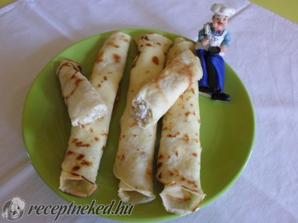 A túrót kikeverjük a felaprított kaporral és a porcukorral, majd egyesével betöltjük a palacsintákat.
