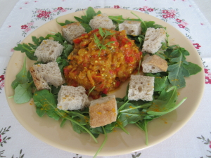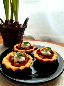 Füstölt pulykacombbal töltött kosárkák, fokhagymás joghurttal
