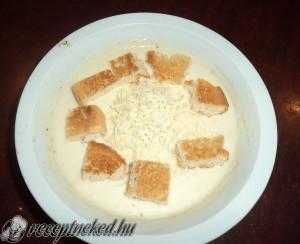 Fokhagymakrém leves, pirított kenyérkockával és reszelt sajttal