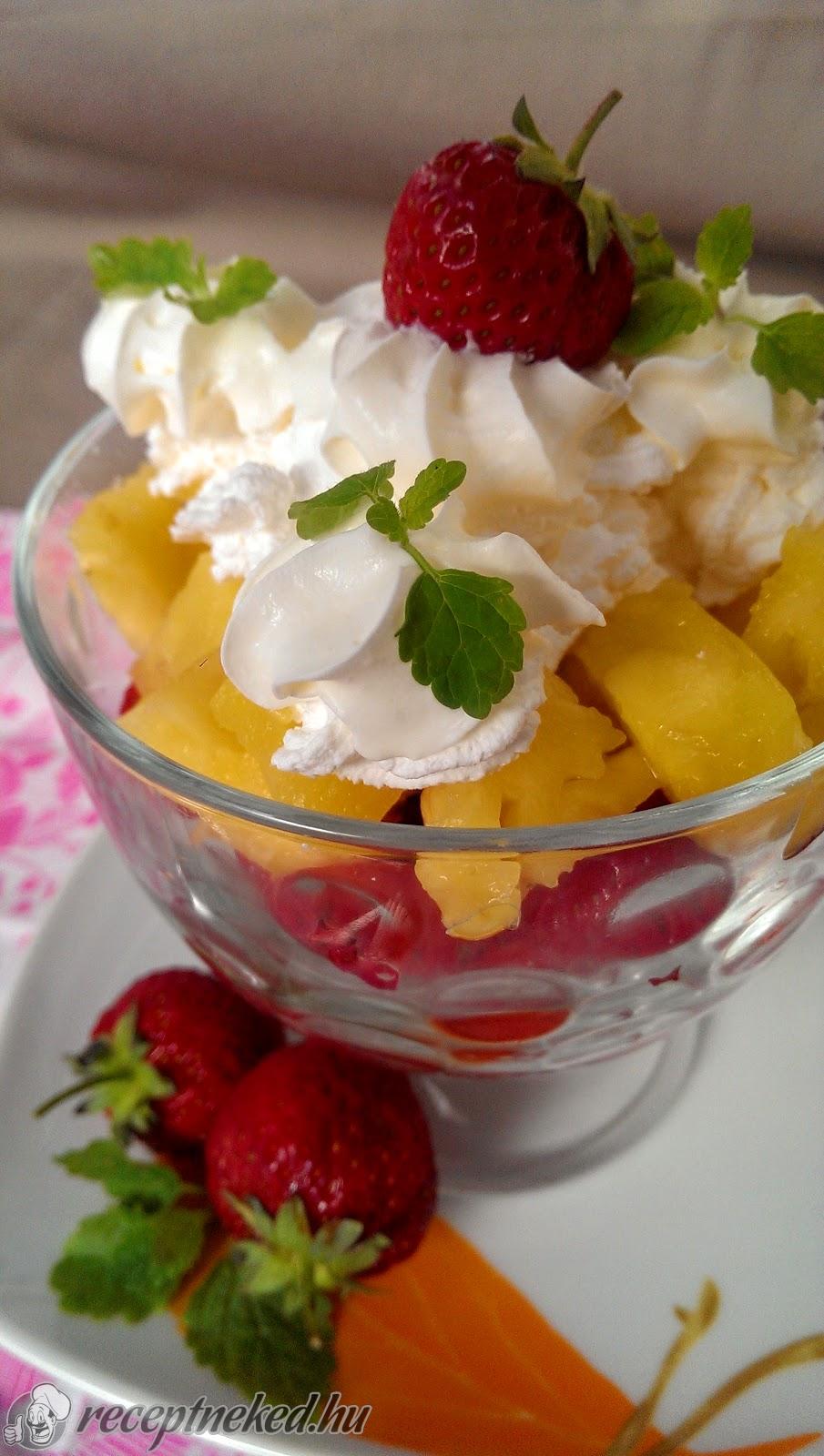 Tálaláskor kevés lével együtt 2 kehelybe szedjük előbb az epret, aztán az ananászt.