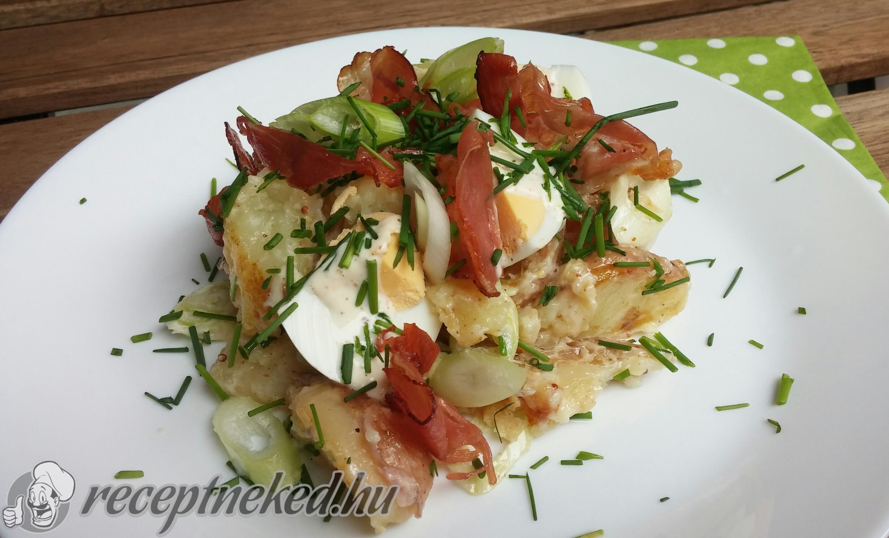A burgonyát a tojással, valamint az aprított snidling- és újhagyma felével összekeverjük, és leöntjük az öntettel. Az így kapott burgonyás/tojásos salátát tányérokra porciózzuk, a pirított sonkadarabokkal és a maradék snidlinggel, újhagymával díszítjük.