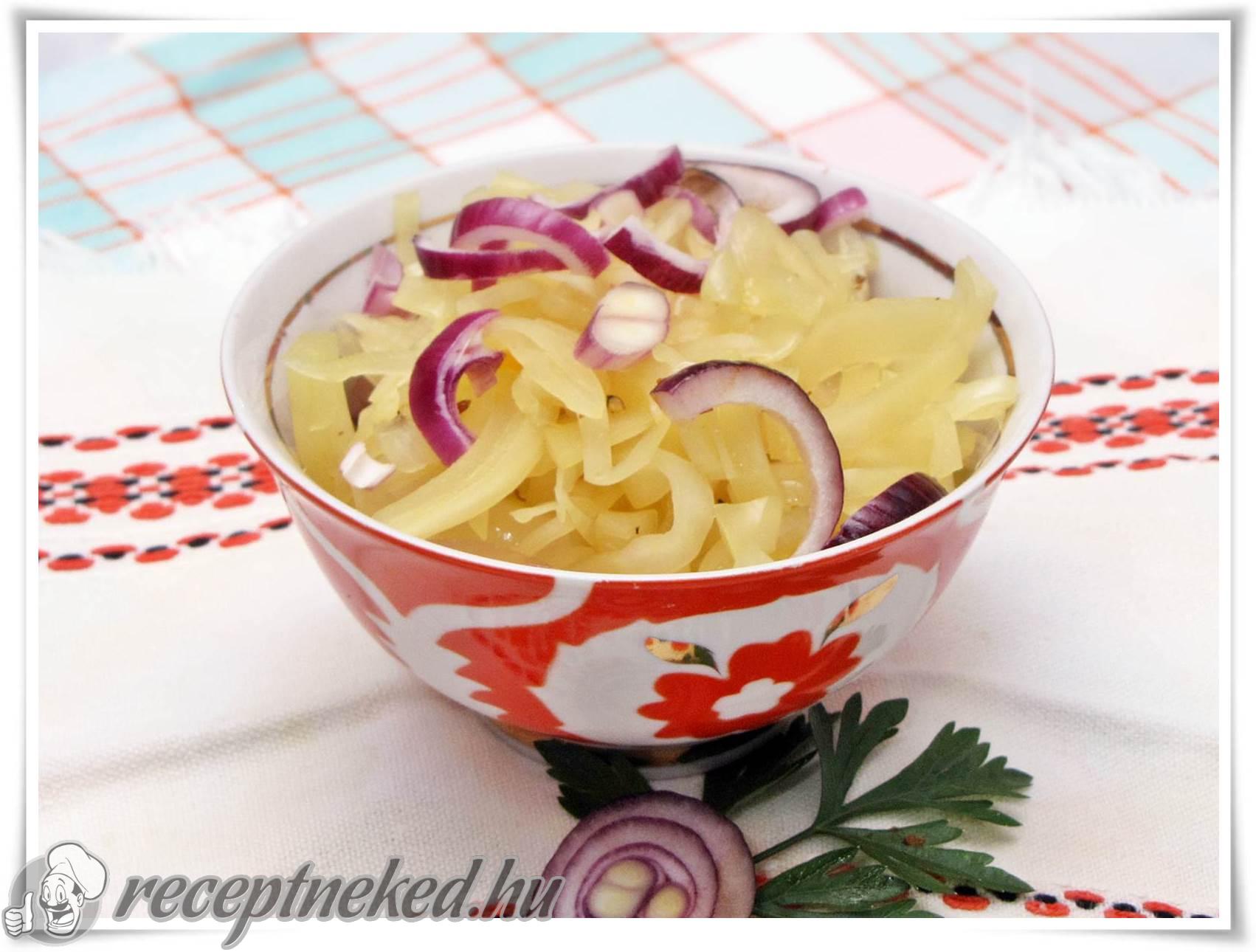 A káposztát vékony csíkokra szeljük, vagy legyaluljuk. Kicsit megsózzuk, fél órát állni hagyjuk. Felöntjük forró ecetes vízzel, melybe kevés őrölt köményt is keverünk, és addig hagyjuk benne “érlelődni” a káposztát, míg az teljesen ki nem hűl.