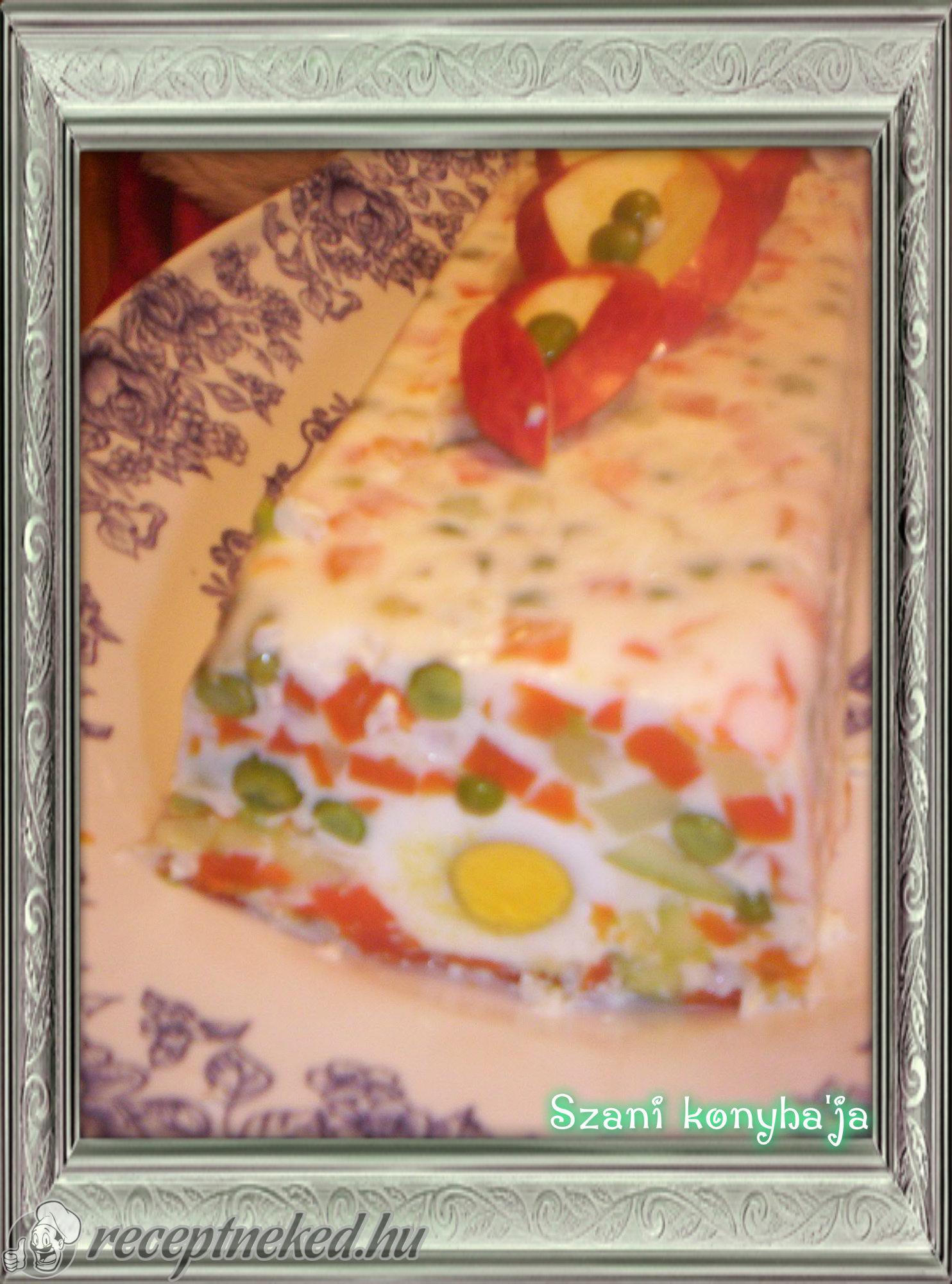 Díszítjük zöldfűszerrel, pirosarany pöttyel és tálalásig a hűtőszekrényben tároljuk.