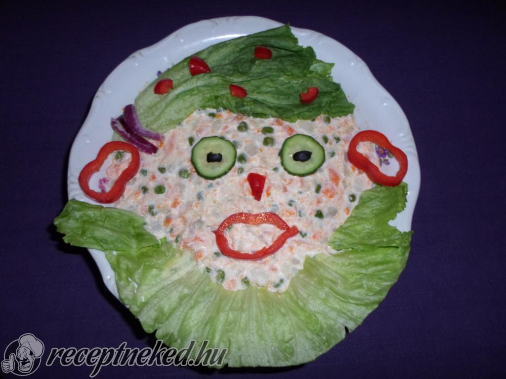 A zöldségeket beletesszük a majonézbe, és jól átforgatjuk. A salátát behűtve kínáljuk.