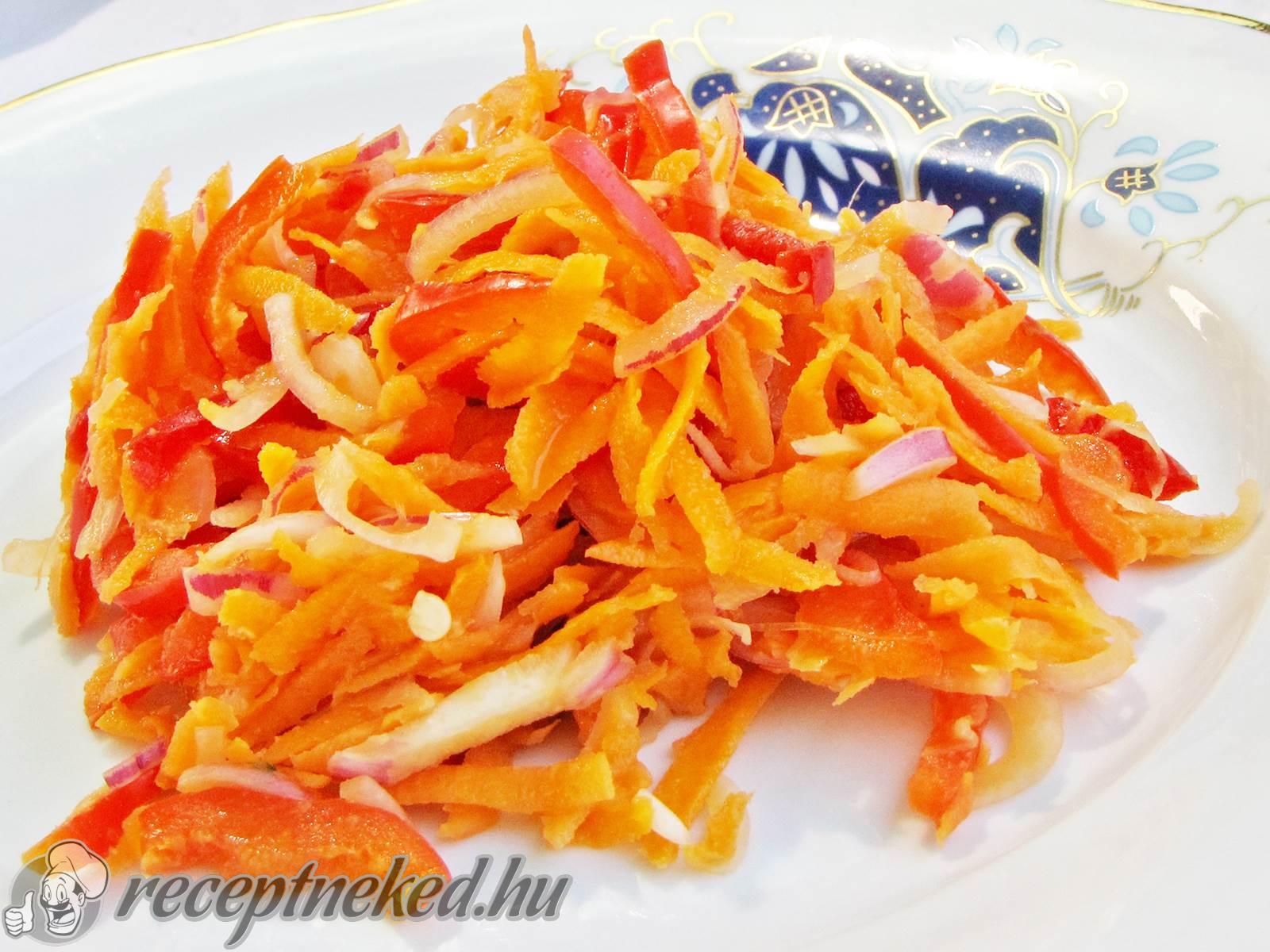 Összekeverem a hozzávalókat, meglocsolom az olívaolajjal és almaecettel, majd ismét összekeverem.