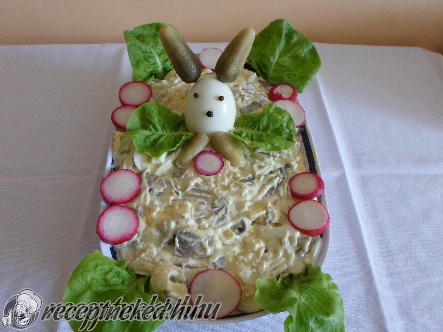 Tetejére díszítésként a főtt tojásból nyuszit készítünk. Egész bors a szemei és az orra, savanyú uborkákat ketté vágjuk, ezek lesznek a fülei és a tappancsa.