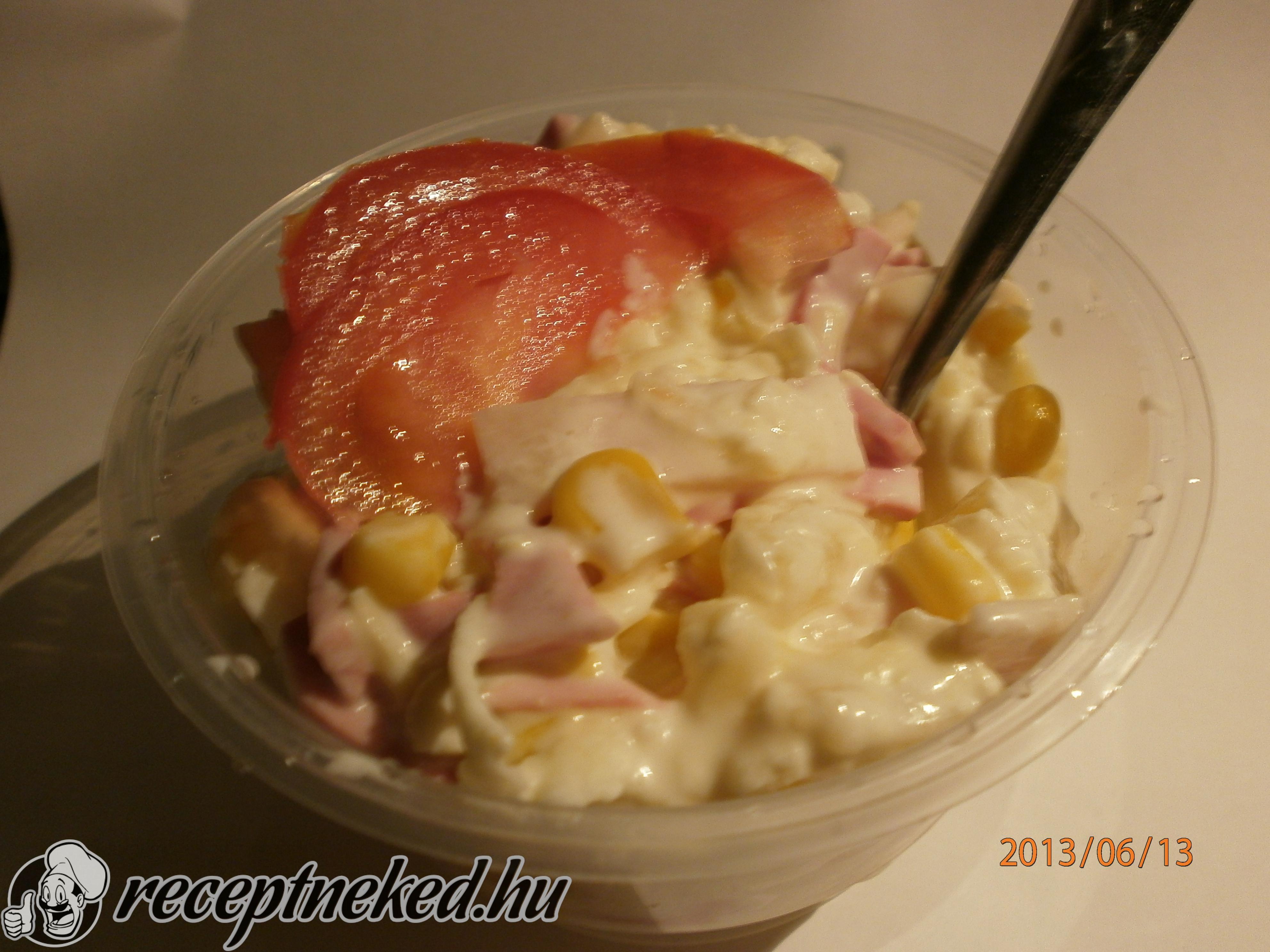 A tejfölt összekeverjük a kaporral és a sóval. A salátát összevágjuk az uborkával és a paradicsommal, majd az öntetet ráöntjük és összeforgatjuk.