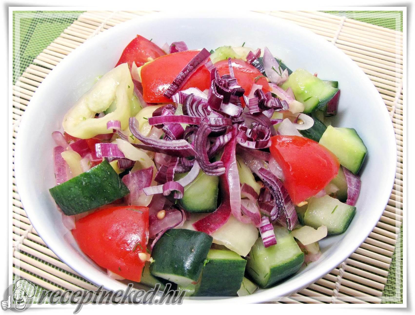 A salátát összevágjuk az uborkával és a paradicsommal, majd az öntetet ráöntjük és összeforgatjuk.