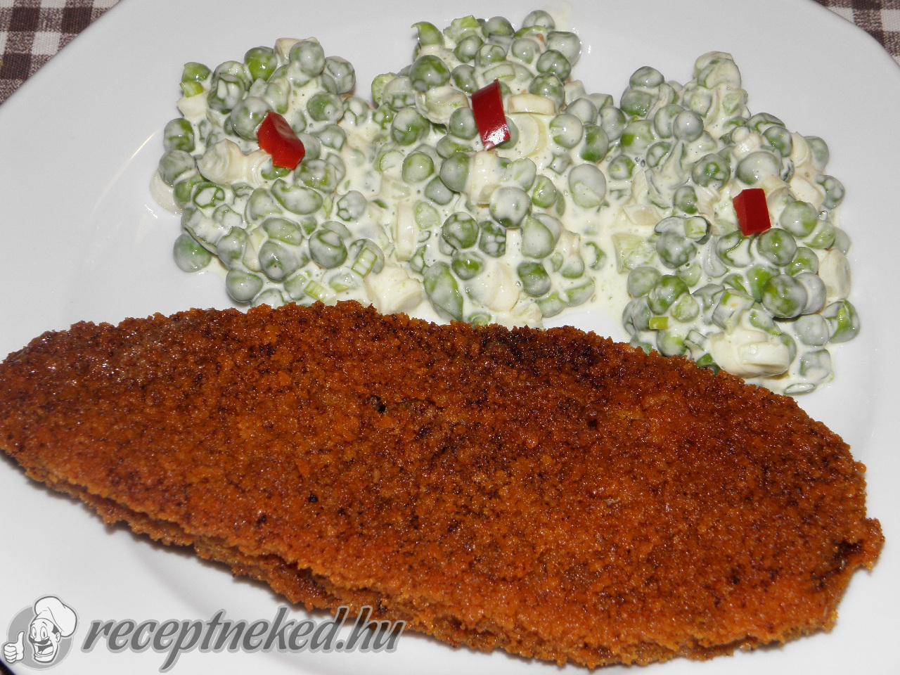 A halat fagyott állapotban bő, forró olajban kisütjük és a jól behűtött majonézes borsóval kínáljuk.
