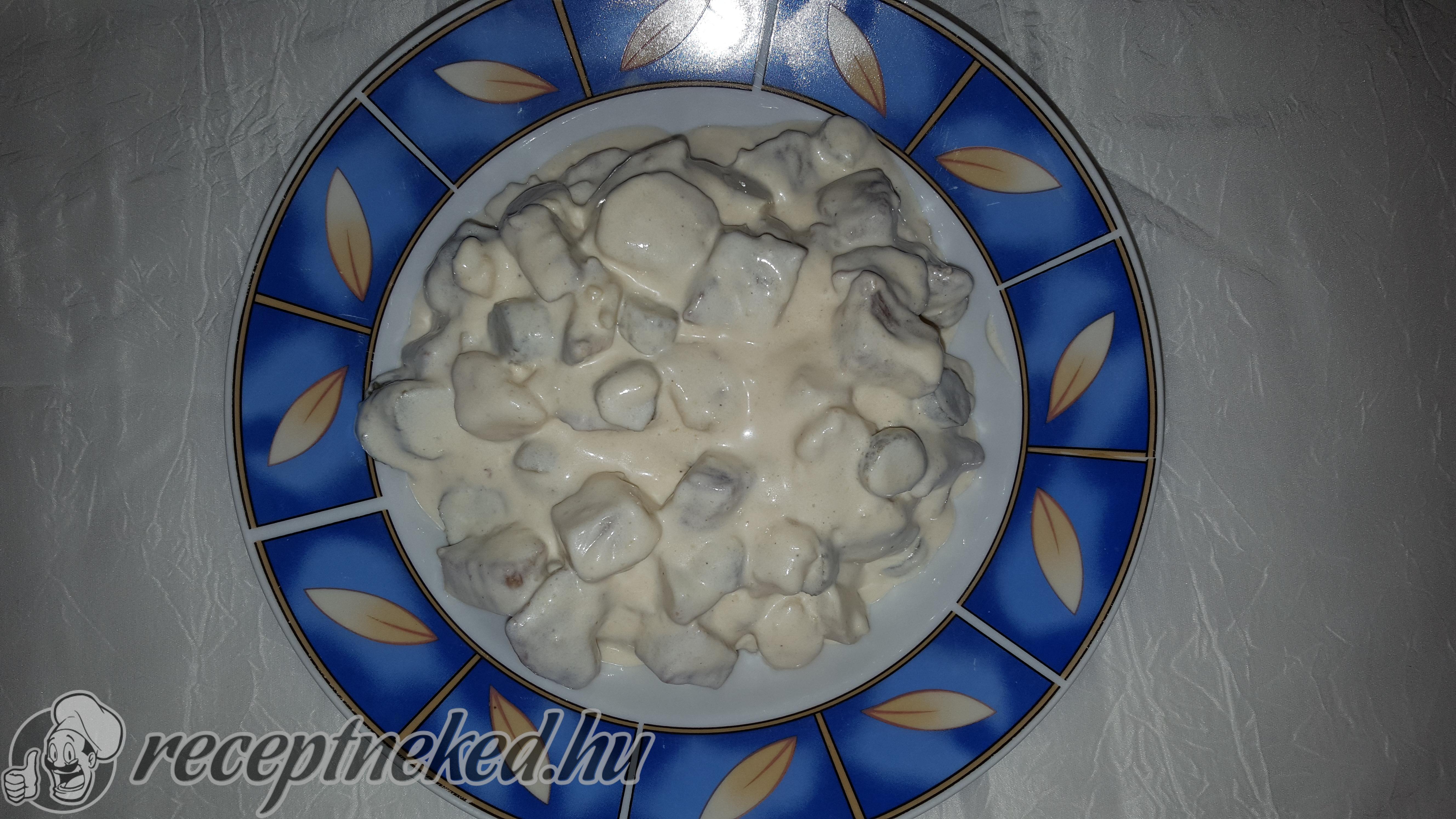 Az összevágott húst és a zöldségeket egy tálba tesszük, majd ráhalmozzuk a majonézes öntetet és összekeverjük. 2 órára hűtőbe tesszük, hogy az ízek összeérjenek.