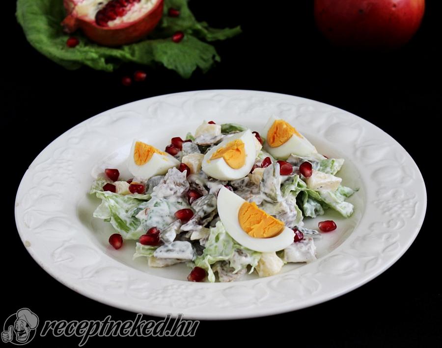Tálaláskor tegyük a salátát egy tányérra, majd helyezzük rá a cikkekre vágott tojást, szórjuk meg a gránátalma maggal, és úgy kínáljuk.