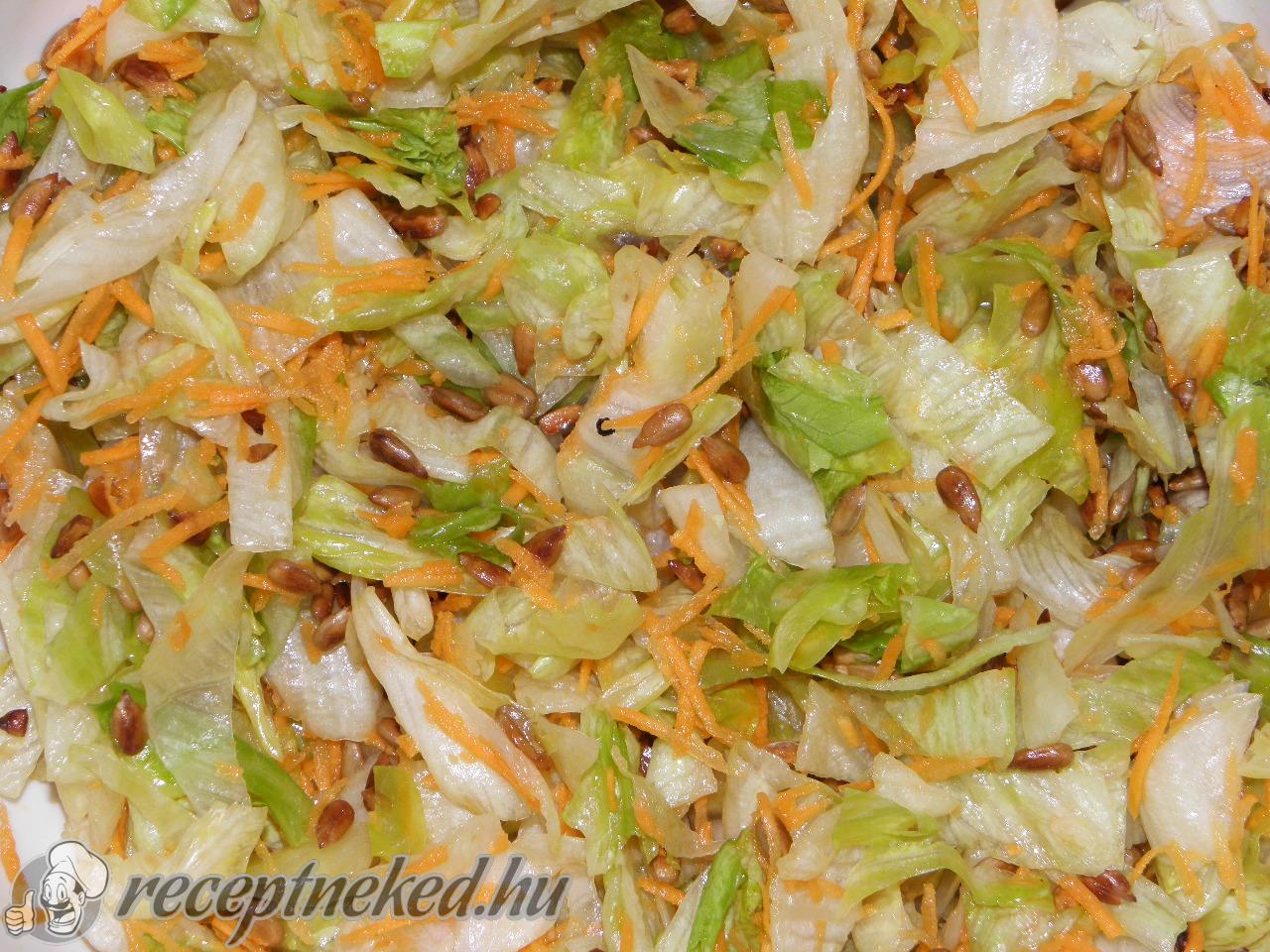 A napraforgómagot egy forró serpenyőben szárazom megpirítom, megvárom amíg meghűl, majd belekeverem a salátába.