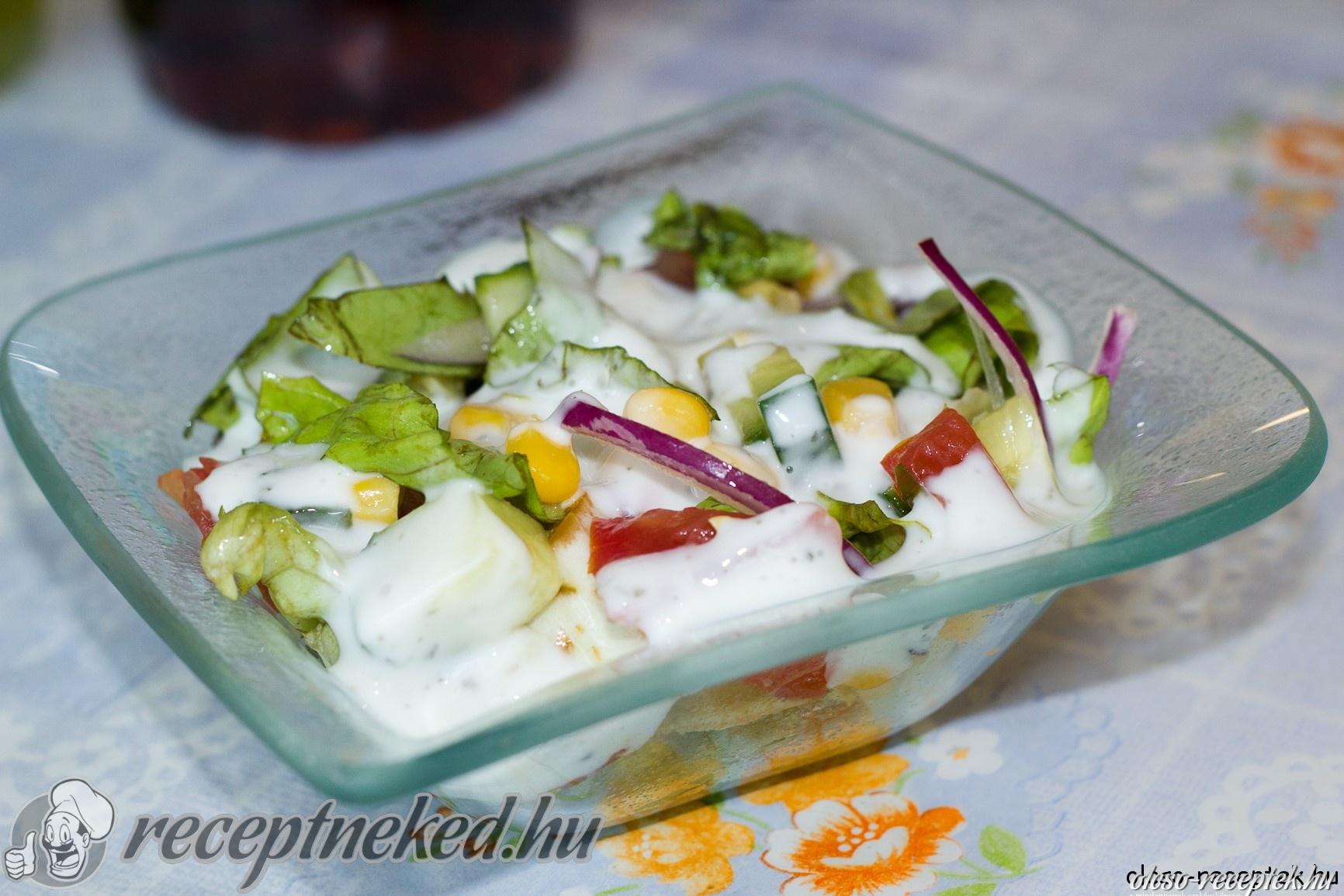 A zöldségeket felaprítjuk és egy tálba tesszük. Alaposan összeforgatjuk. A kaprot apróra összevágjuk, majd a joghurthoz adjuk a majonézzel együtt. Kevés citromlevet keverünk bele és ízlés szerint sózzuk, borsozzuk. A salátát az öntettel tálaljuk.