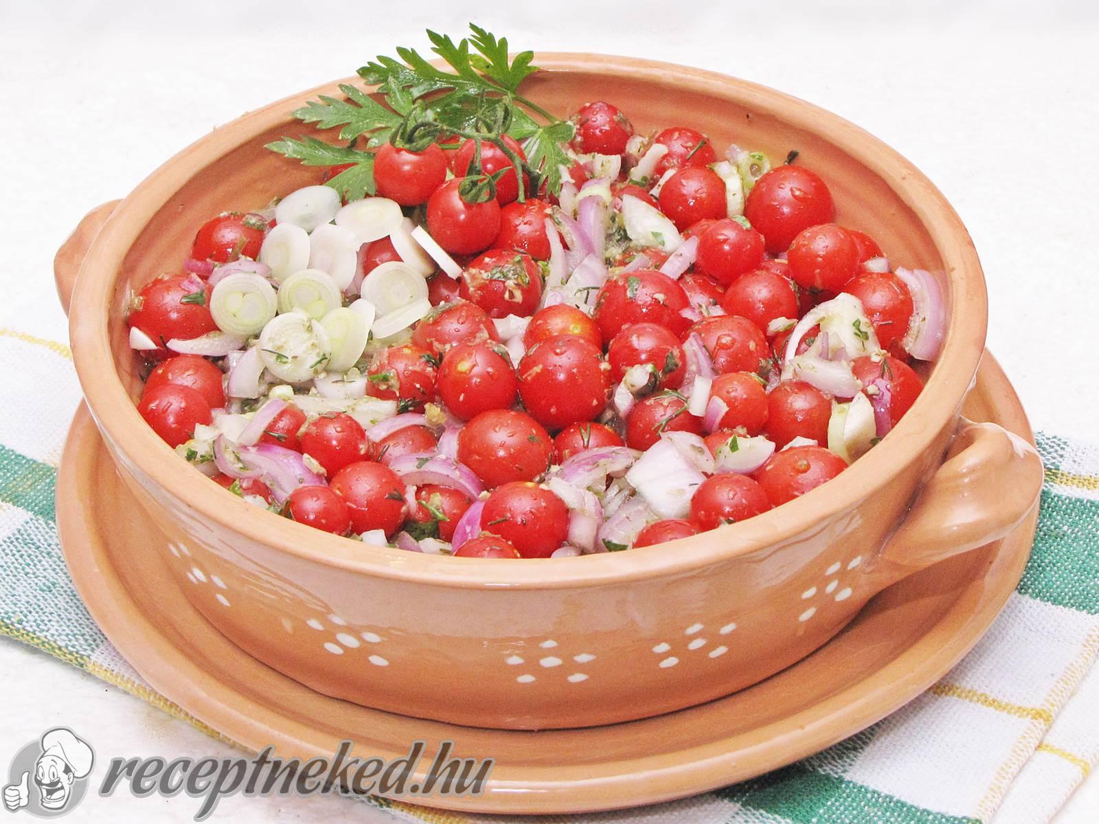 A paradicsomokat megmossuk, összekeverjük a felkarikázott újhagymát, megöntjük olíva olajjal, 1 ek almaecettel, és kevés nagyon apróra vágott petrezselyemzöldet adunk hozzá.