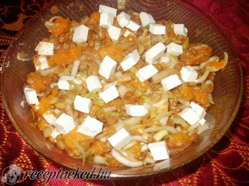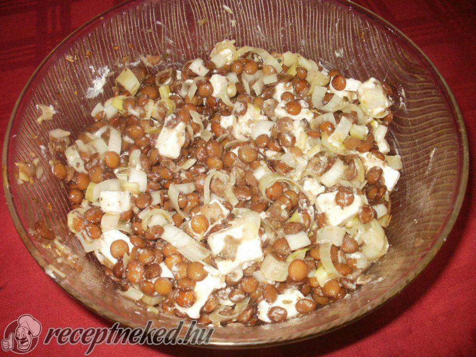 Közben a tejfölt elkeverjük a majonézzel és a mustárral, majd porcukorral ízesítjük. A káposztát, ha nagyon savanyú, átmossuk és lecsepegtetjük. A lilahagymát megtisztítjuk és felszeleteljük. A lencsét kihűtjük, lecsöpögtetjük.