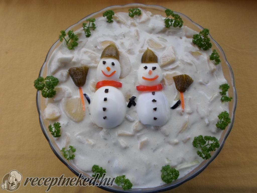 Főzzük meg a tojásokat keményre, pucoljuk meg és vágjuk apró kockákra. Ezeket keverjük hozzá a majonézes masszához.