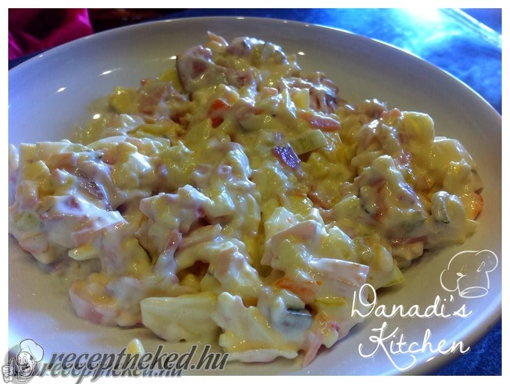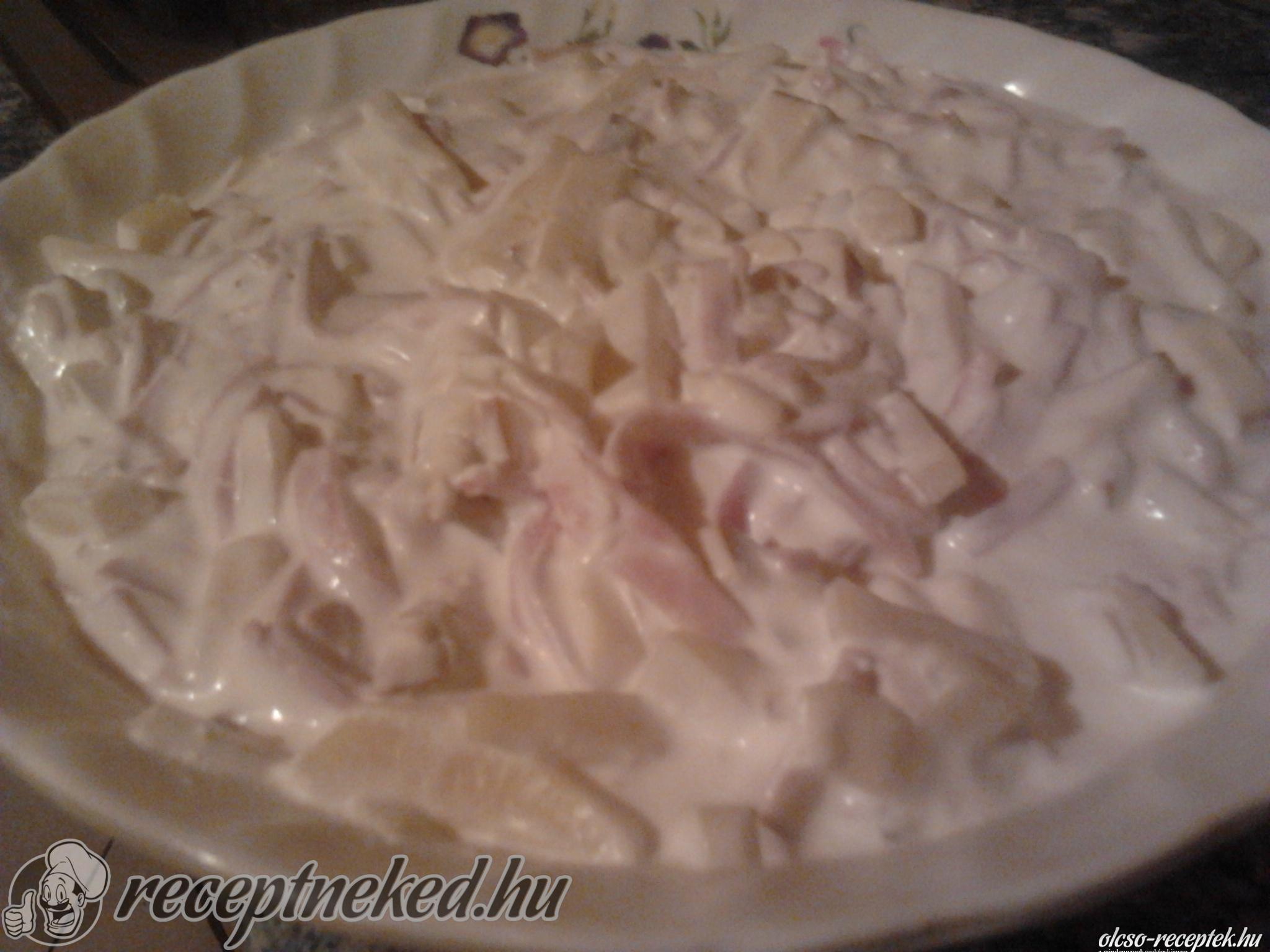 A sonkát vékony csíkokra vágjuk és belekeverjük az öntetbe. Megkóstoljuk és ha szükséges, akkor utánízesítjük. Kevés aprított petrezselyemzöldet is adhatunk hozzá.