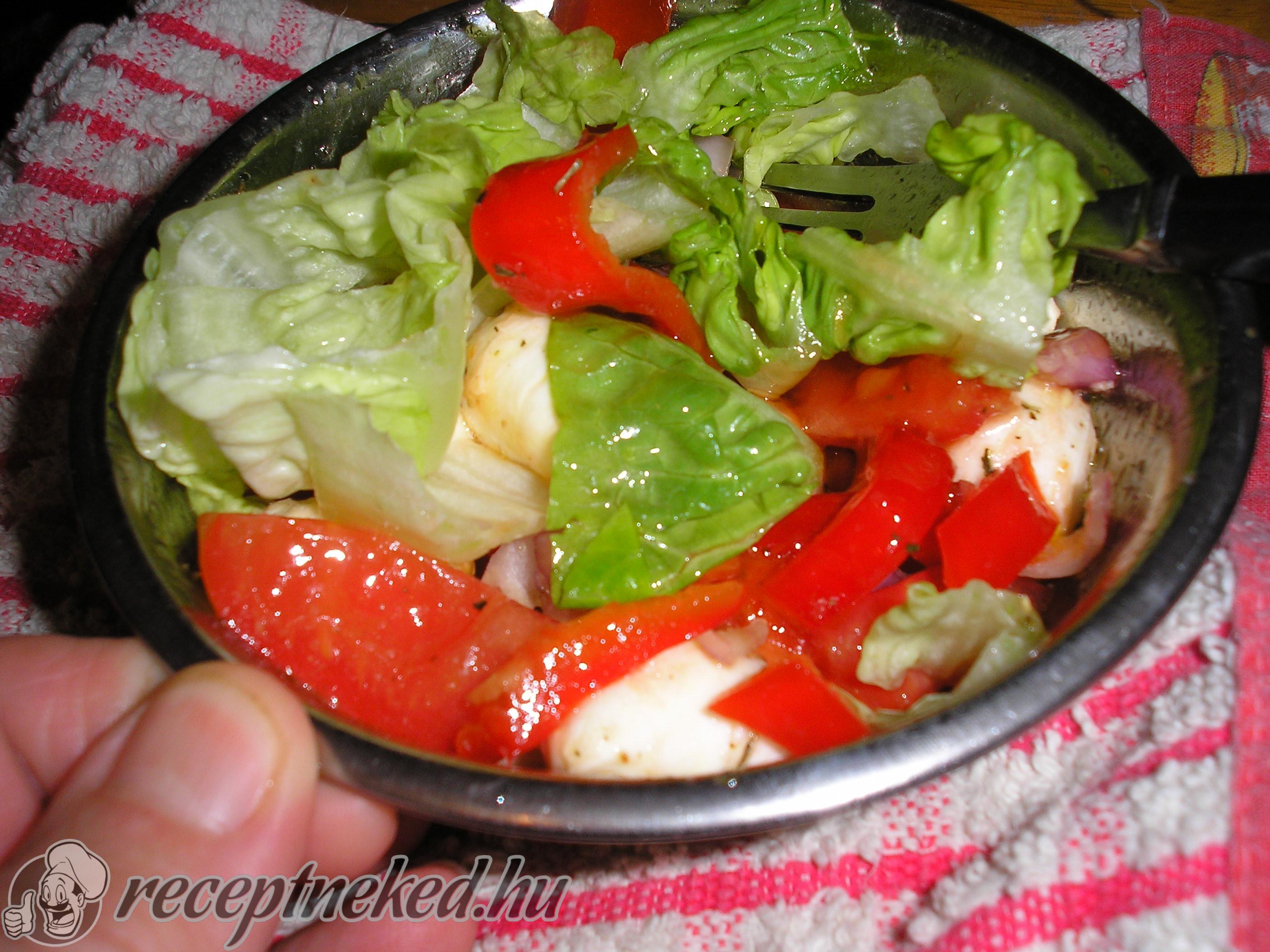 A paprikát és a paradicsomot felszeleteljük, a hagymákat felkarikázzuk, majd a mozzarellával együtt a salátára halmozzuk.