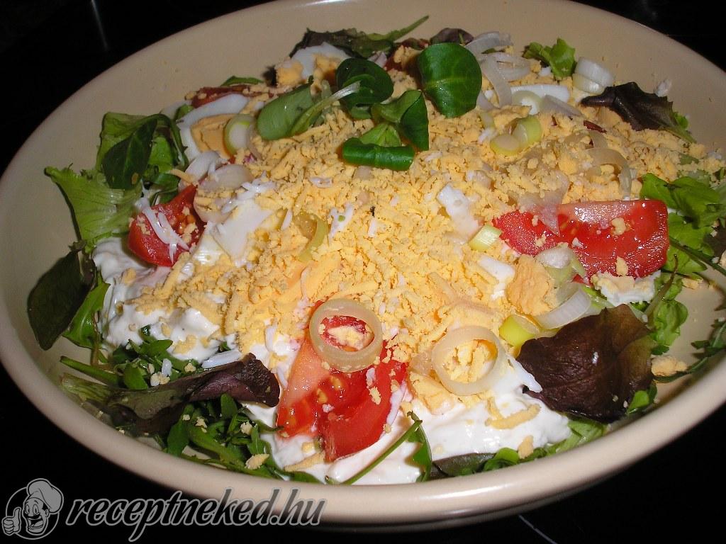 Egy nem túl mély tálat kibélelünk olasz salátakeverékkel, belesimítjuk a krém két harmadrészét, megrakjuk a tojáskarikák felével, majd tovább rétegezzük a krémmel, a tojás és hagymakarikákkal, amíg csak hozzávalókból tart.