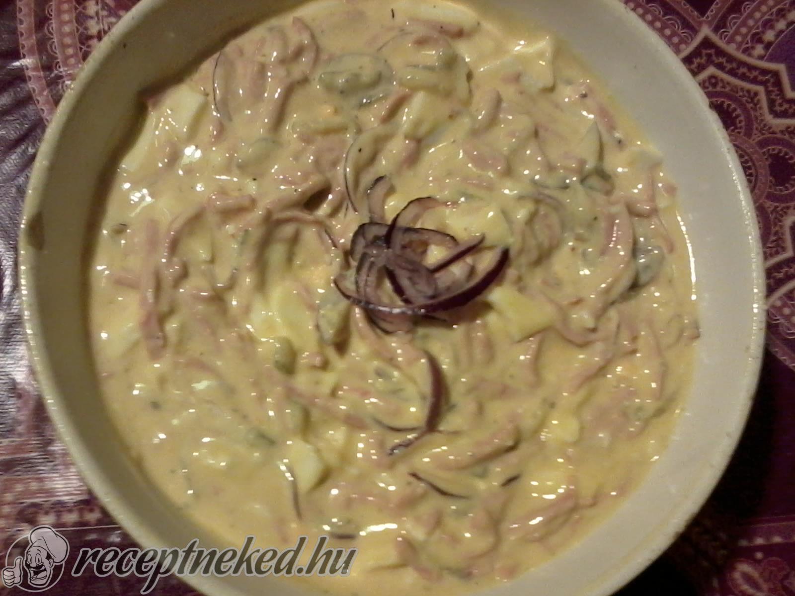 A szeletelt hagymát tálba tesszük, picit megsózzuk és összekeverjük. A maradék tojásokat és fehérjéket apróra vágjuk, és a hagymához keverjük. Hozzáadjuk a reszelt párizsit és az uborkát is, majd összekeverjük a joghurtos majonézzel. Fél órára hűtőbe tesszük, hogy összeérjenek az ízek.