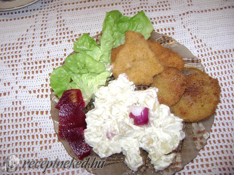 A tartár hozzávalóit összekeverjük (kóstoljuk meg, ízlésünk szerint változtathatunk a fűszerek, ízesítők arányán) és végül beleforgatjuk a krumplit, illetve a karikára szelt hagymát.