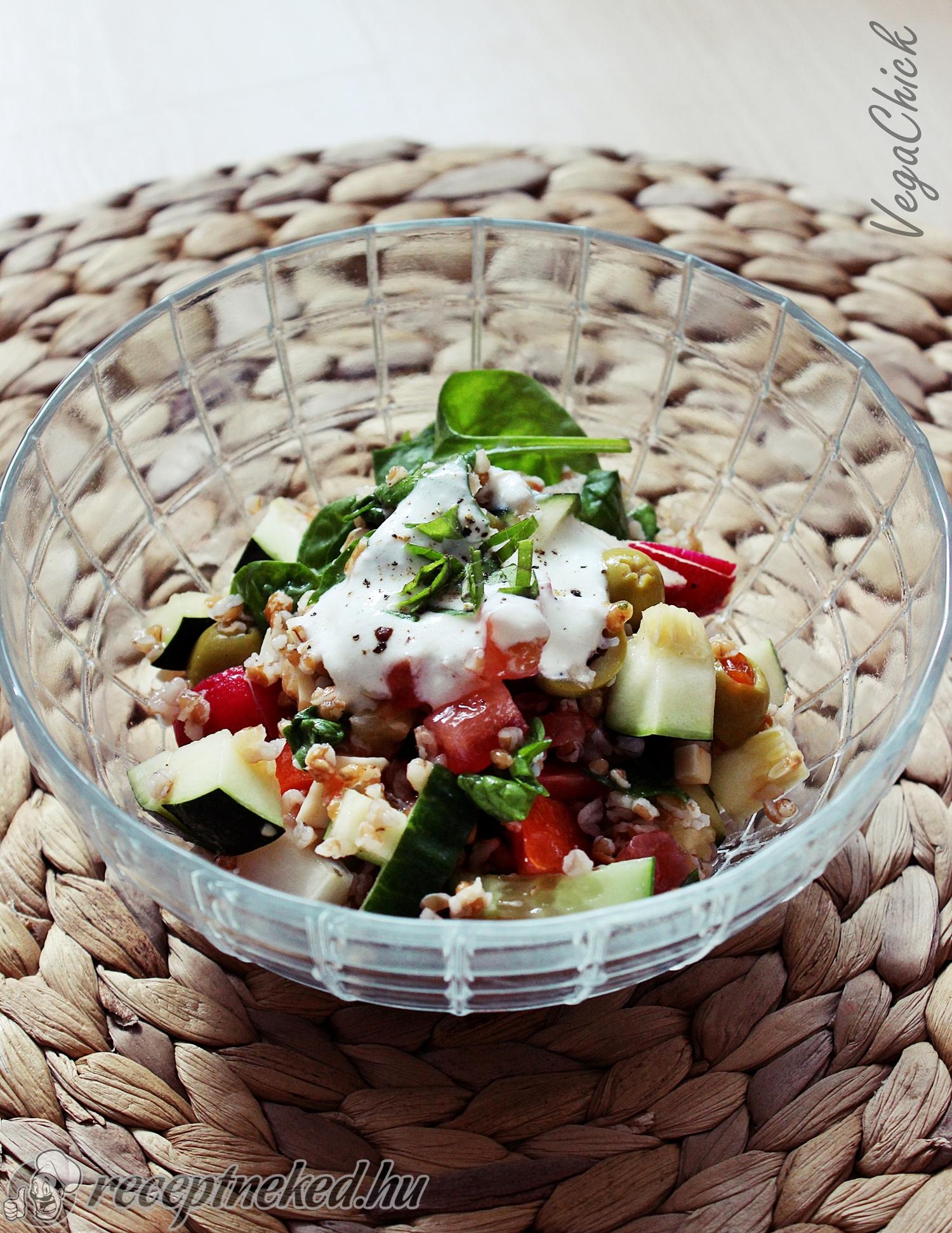 Eközben kockázzuk/szeleteljük fel a zöldségeinket, keverjük össze, és enyhén sózzuk-borsozzuk őket. Vegyítsük el a zöldség-mixünket a zöld leveleinkkel, majd a kihűlt bulgurral.