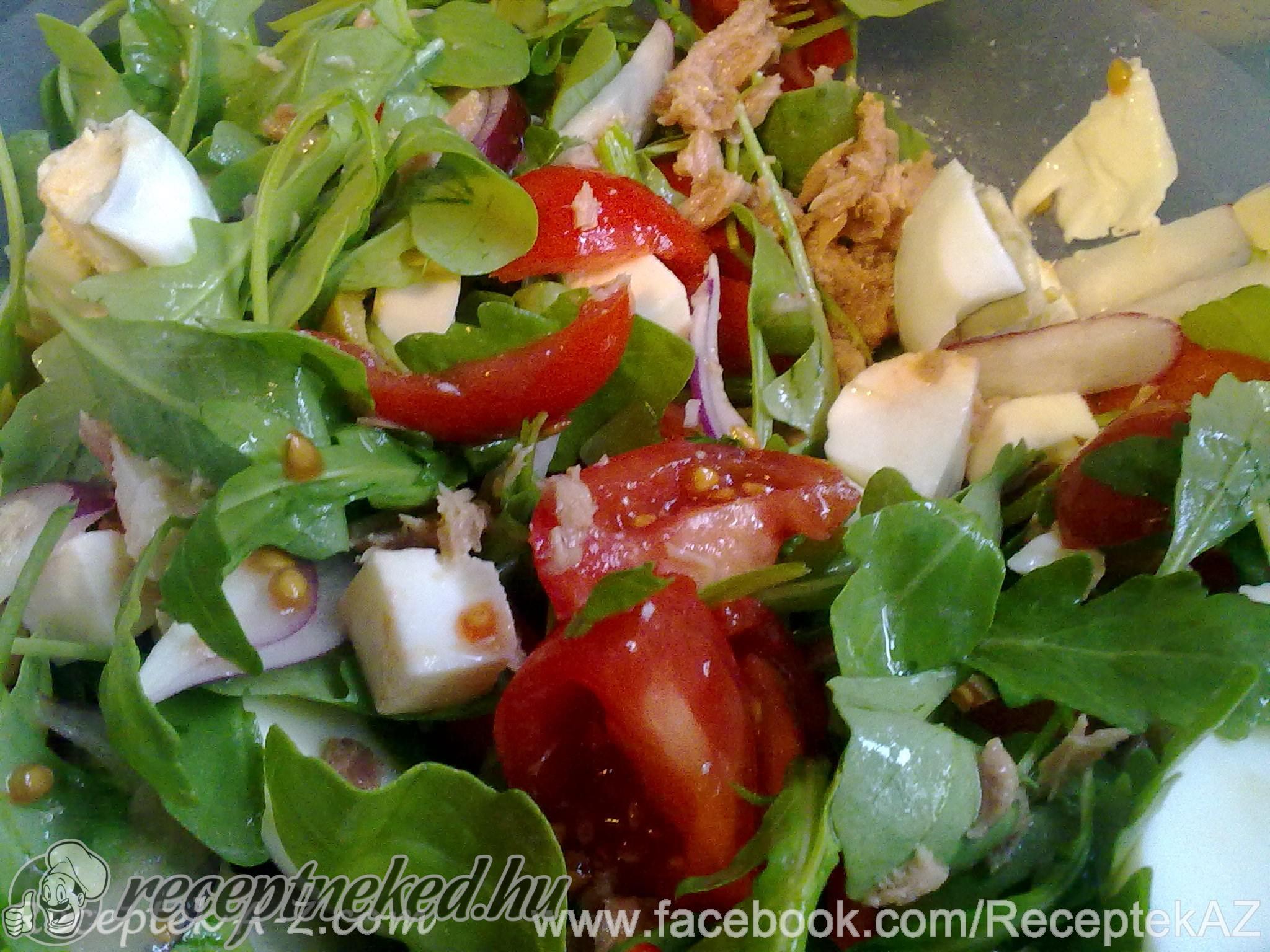A tojásokat keményre főzzük. A paradicsomot felvágjuk, a mozzarellát, főtt tojást kockára vágjuk, az olajbogyót, hagymát felszeleteljük. Egy tálba összekeverjük a felvágott hozzávalókat rádobjuk a megmosott rukkola salátát, óvatosan összekeverjük majd ráhalmozzuk a szétmorzsolt tonhaldarabokat.