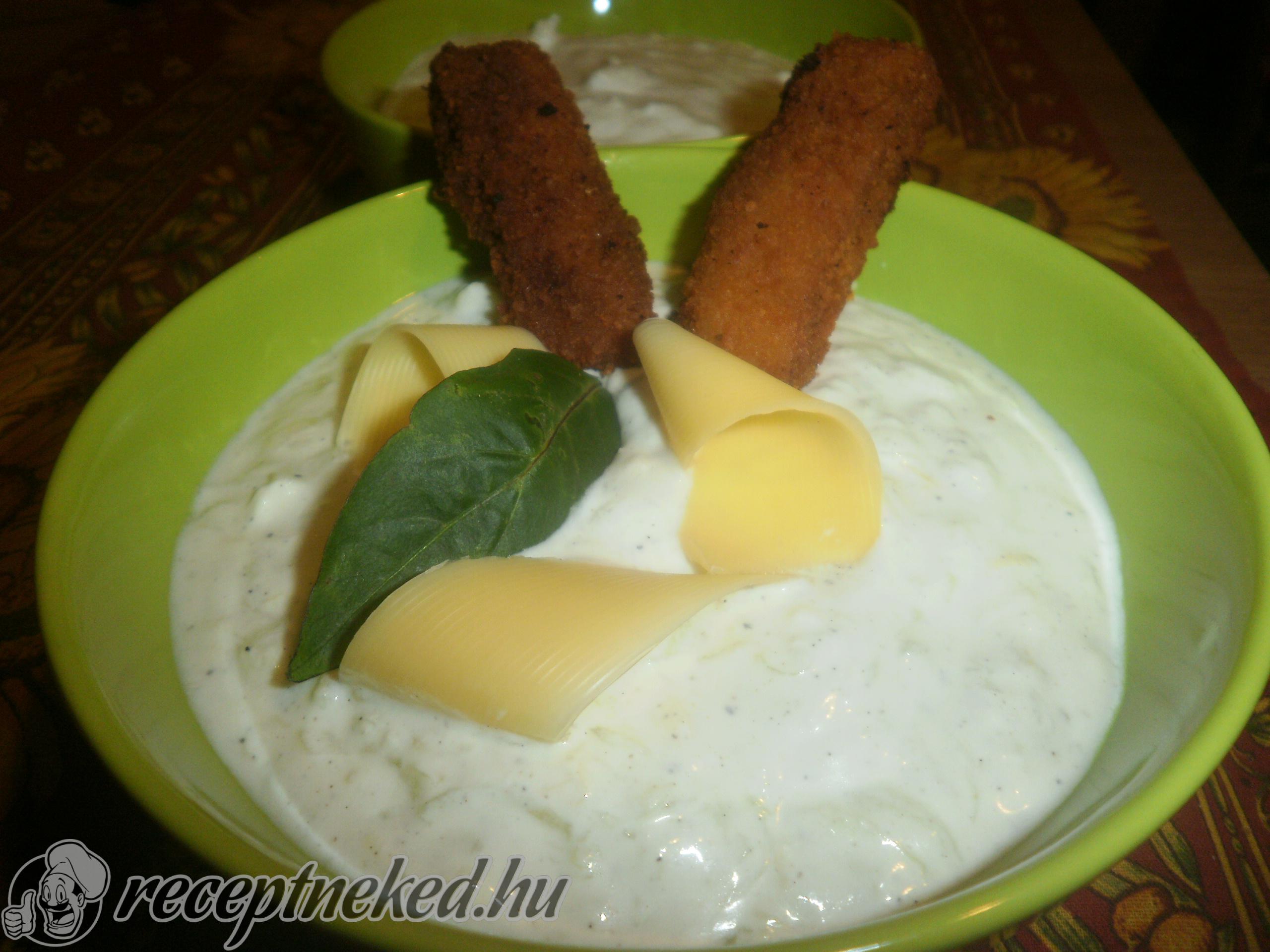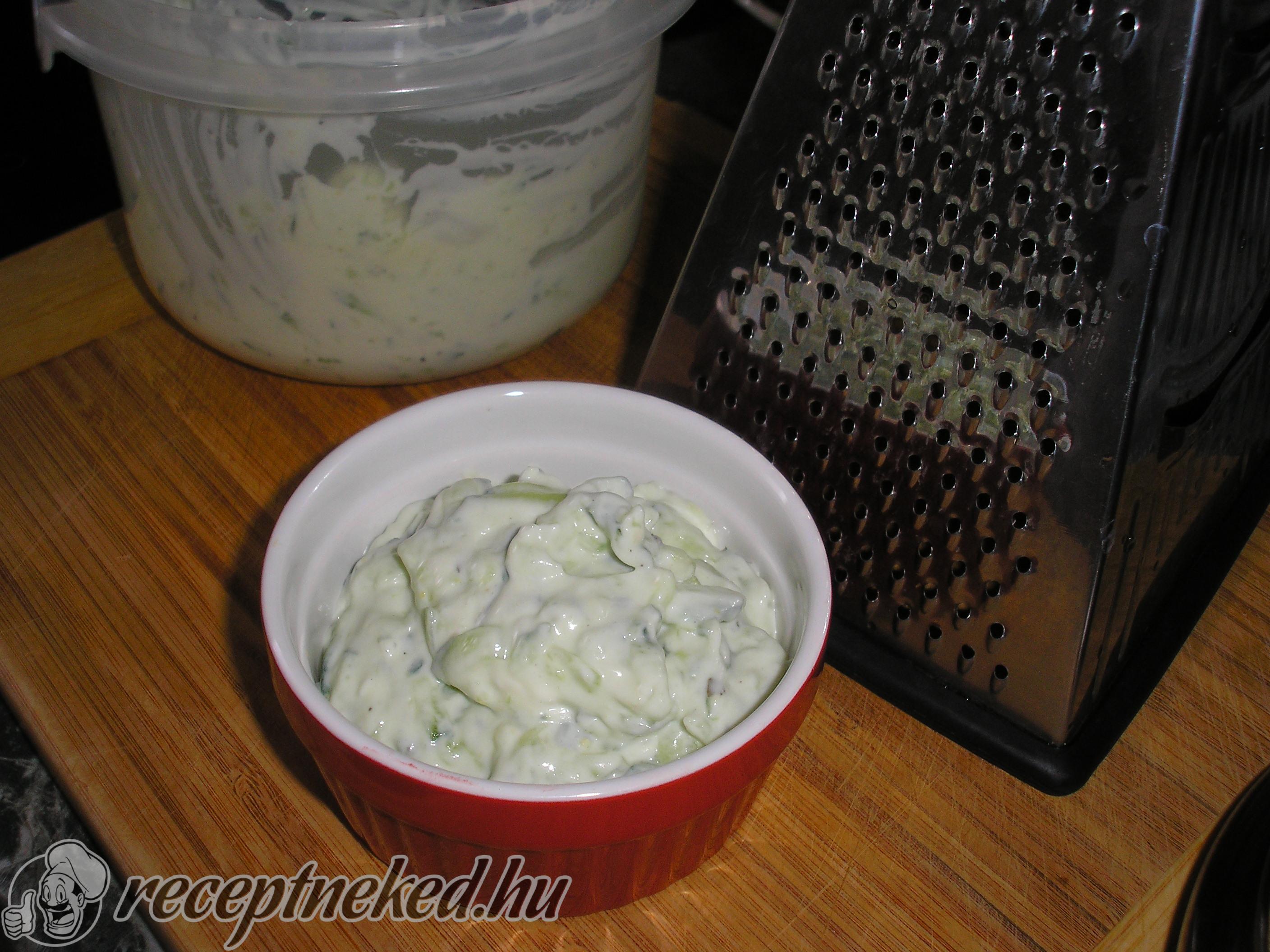Amíg áll az uborka a sóval elkészítjük az öntetet. Ha friss a kaprunk, akkor megmossuk és apróra vágjuk. A totut összekeverjük a kaporral, borssal és az összezúzott fokhagymával.
