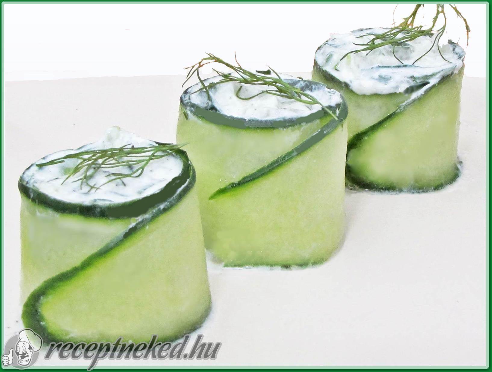 A zselatint felfőztem vízzel, majd a hengereknek való uborkák végeire cseppentettem keveset, és megformáltam a hengereket. A többi zselatint a tzatzikihez kevertem, majd beletöltöttem kiskanállal a hengerekbe.