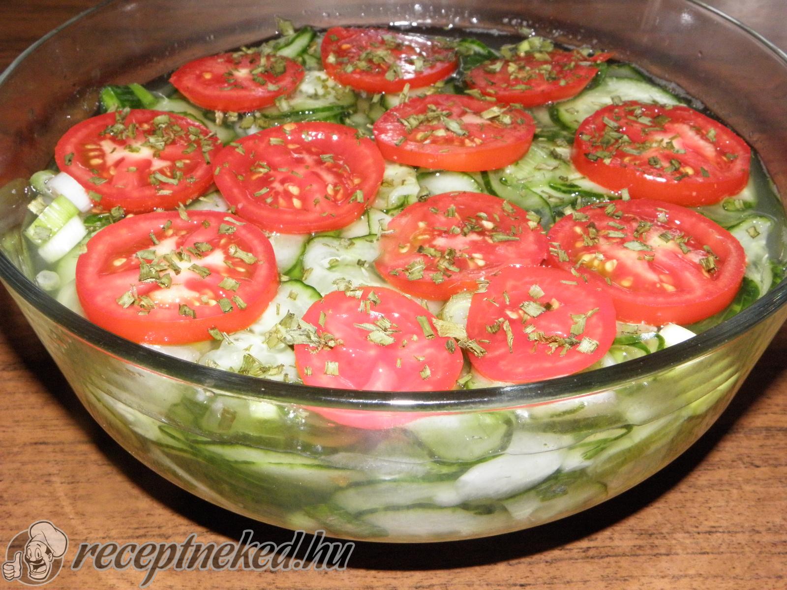 Az uborkát és hagymát kinyomkodom sós léből, elkeverem a saláta lében.