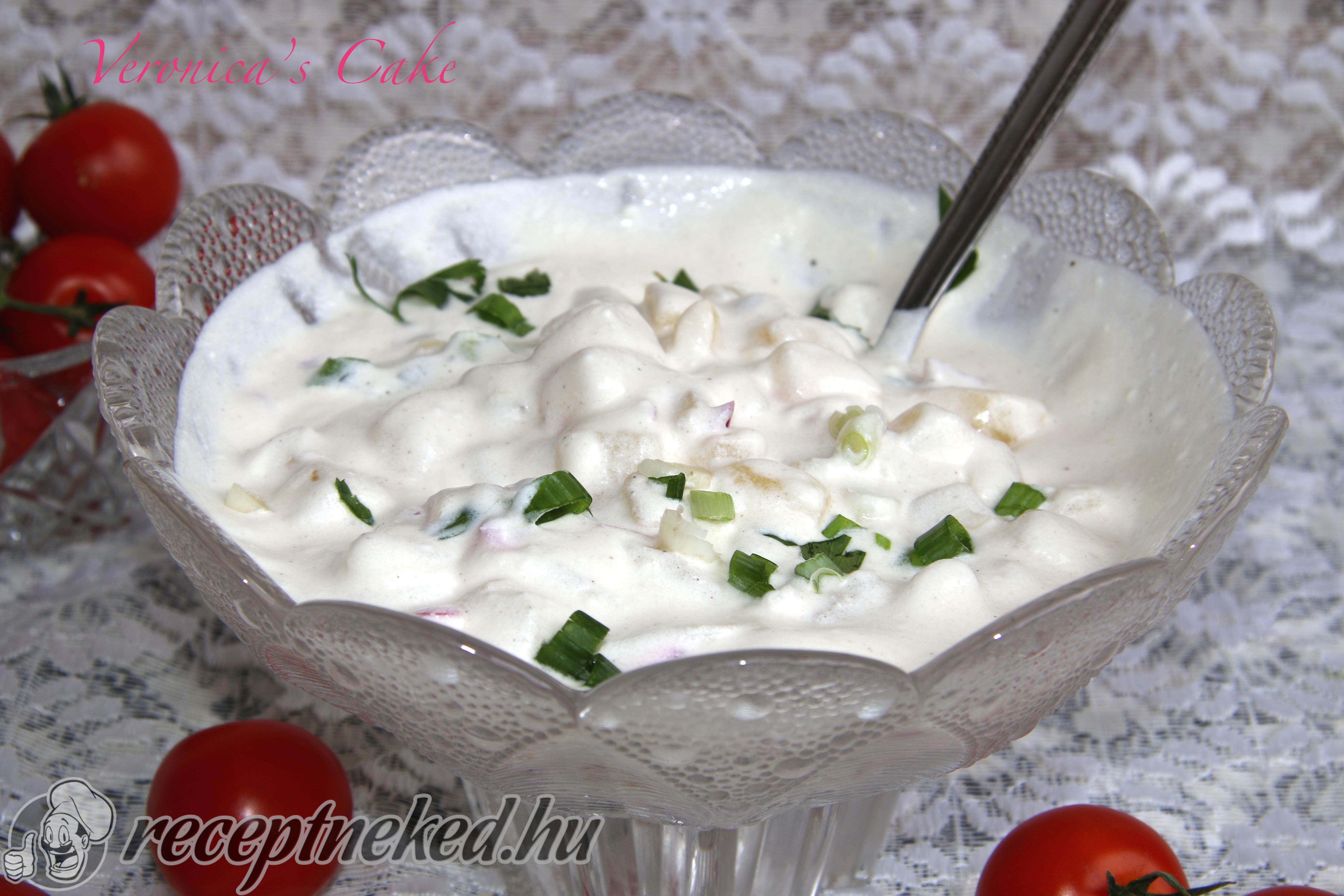 A majonézt, mustárt, tejfölt, citromlevet összekeverjük, sózzuk, fűszerezzük és összekeverjük a krumplival, tojással és a hagymával. Egy tálba tesszük, a tetejére húzunk 1 evőkanál tejfölt.