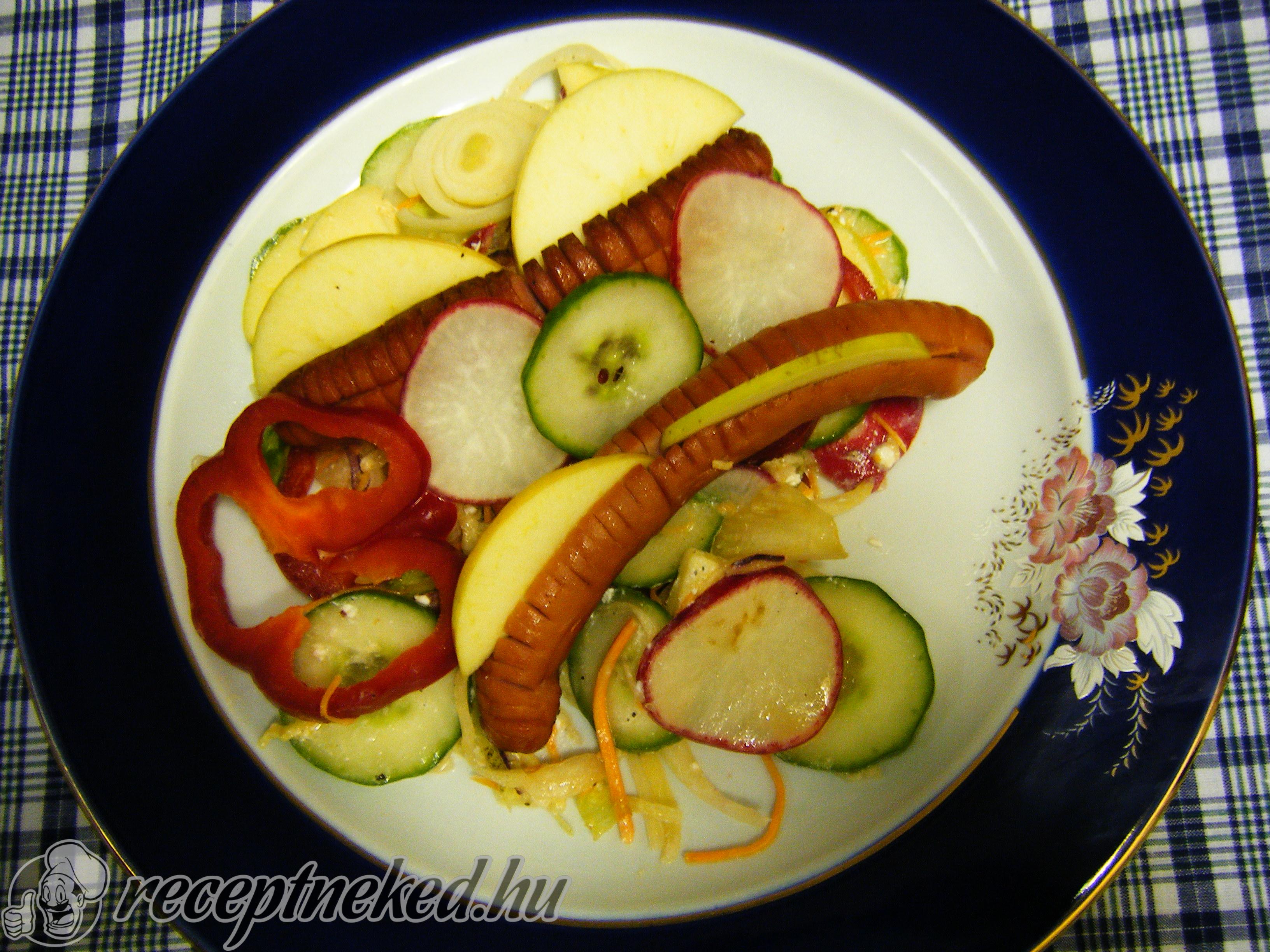 A salátát szedjük tányérra, ízlésesen rendezzük el rajta a grillezett virslit és díszítsük a félretett zöldségekkel.