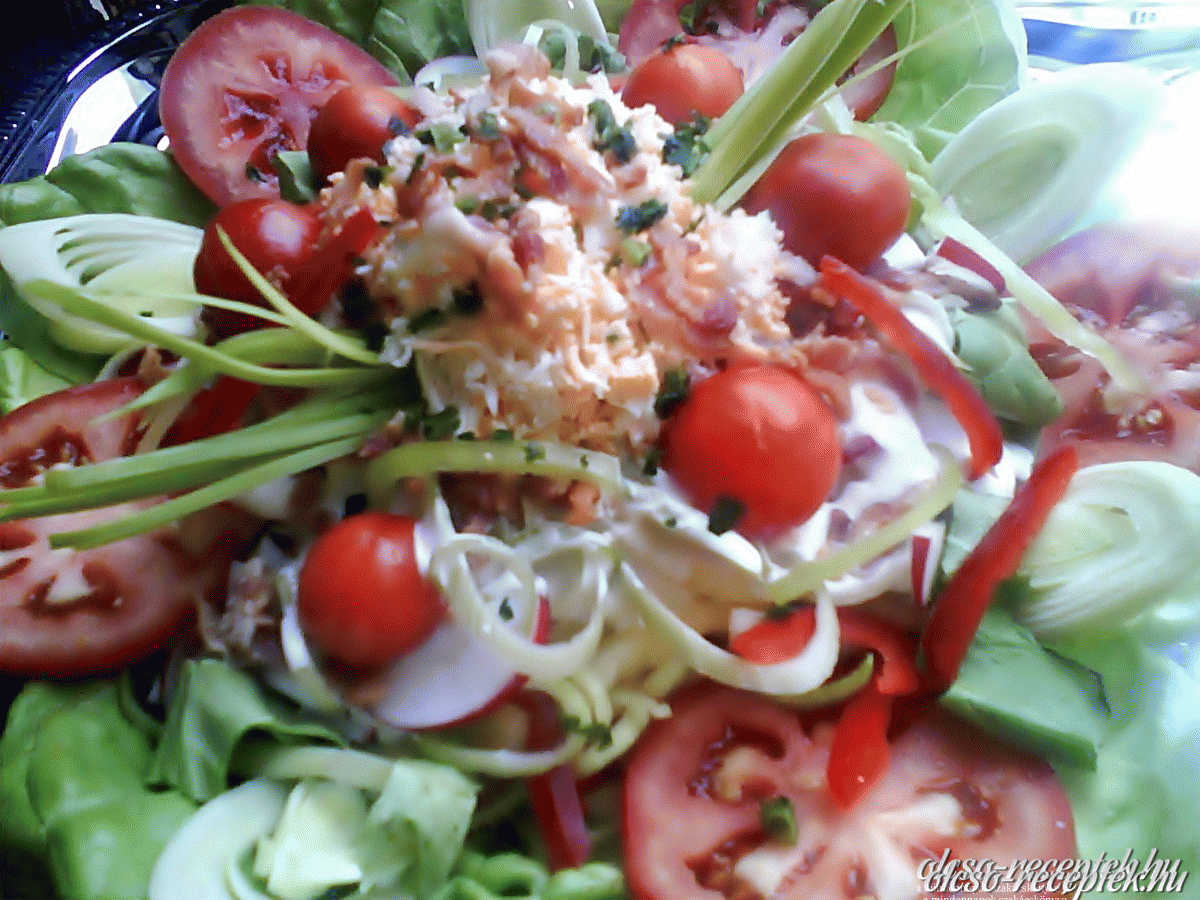 A tojásokat megfőzzük. A bacont csíkokra vágjuk, kipirítjuk. A zöldségeket tetszésünk szerint feldaraboljuk a koktél paradicsom kivételével. 3-4 levél salátát és pár szelet zöldséget tegyünk félre a díszítéshez. A joghurtot kikeverjük egy kevés őrölt borssal és ételízesítővel. A zöldségeket összekeverjük, meglocsoljuk a joghurttal, ráreszeljük a főtt tojást és megszórjuk a kisütött baconnel és petrezselyemmel.