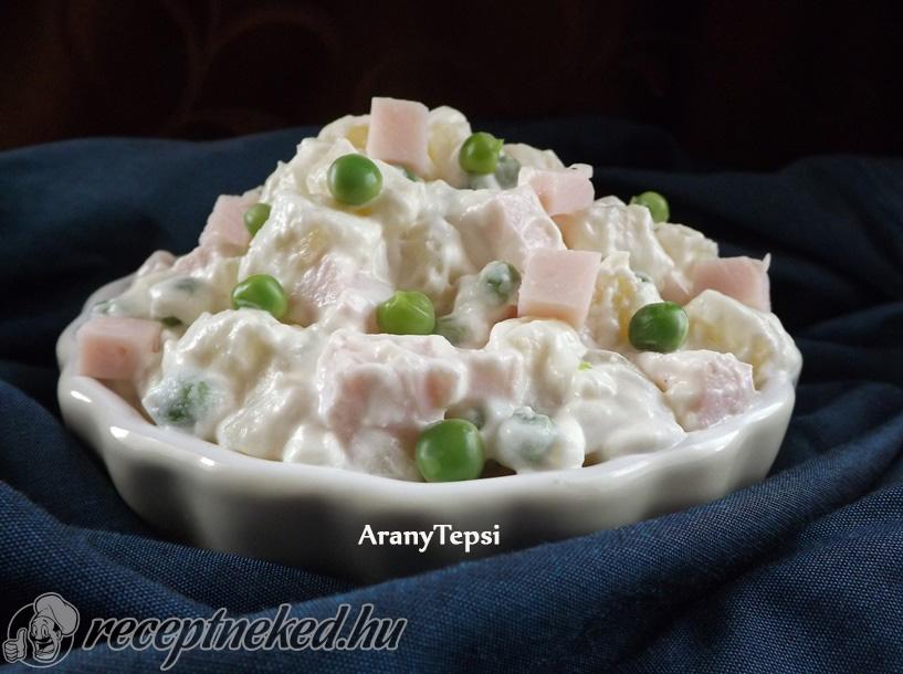 Egy tálban a tejfölt elkeverjük a majonézzel és a mustárral, ízesítjük sóval, borssal. Legvégül beleforgatjuk a sonkát, a borsót és a krumplit.