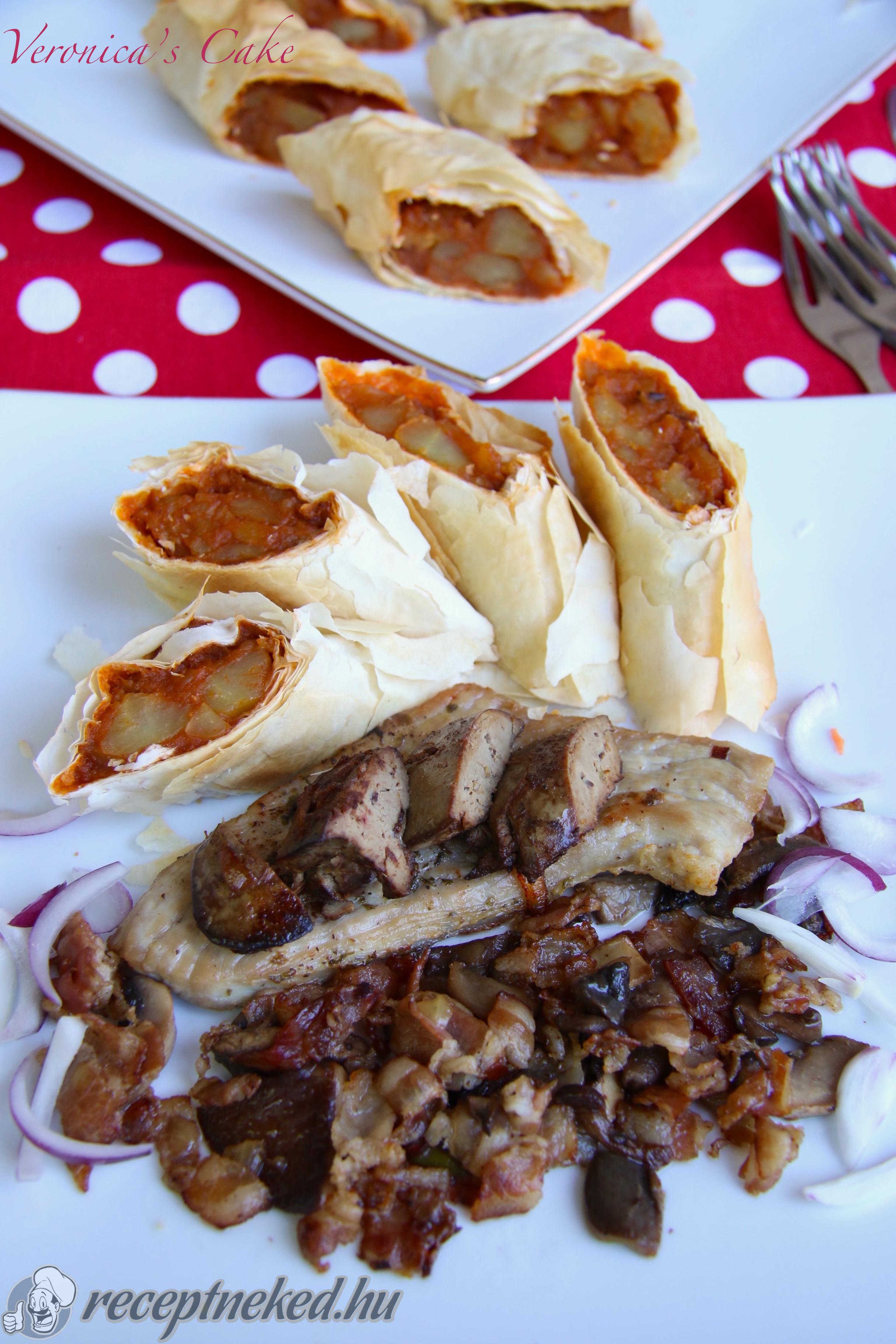 Amikor elkészült a paprikás krumplink, 3 db réteslapot egymásra terítünk és a fele burgonyát eloszlatjuk rajta, mint a rétestölteléket. Feltekerjük, az oldalait behajtjuk, hogy ne folyon ki a töltelék. A maradék réteslappal és burgonyával ugyanígy járunk el.