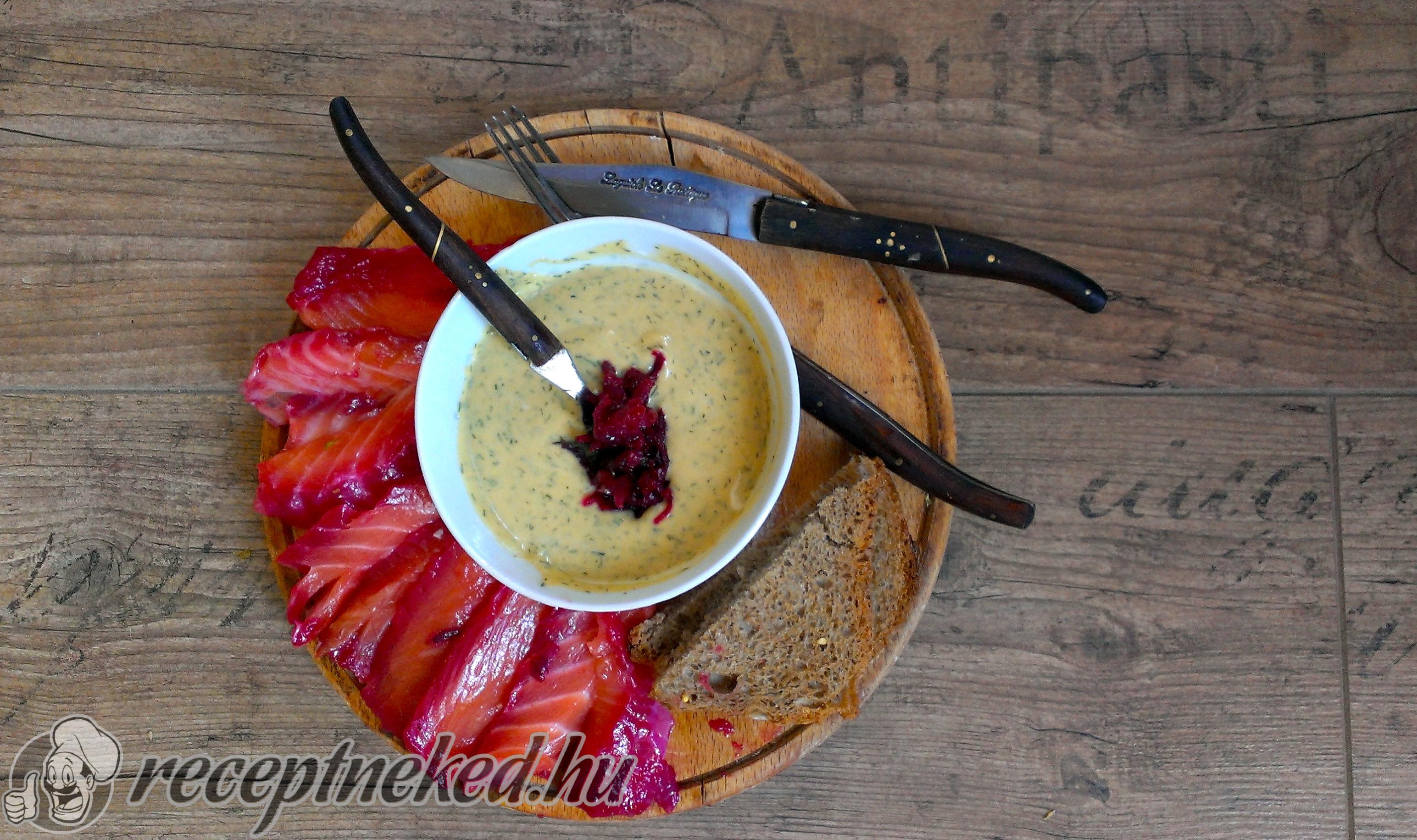 Egy szögletes tálba tegyünk folpackot úgy, hogy mindkét oldalon annyival hosszabb legyen, hogy a végén a lazacot jól be tudjuk vele fedni. Tegyük a folpackra a lazacot a bőrös oldalával lefele, majd szórjuk meg a cukros keverékkel. Erre tegyük rá a kaprot szárral együtt, végül a reszelt céklát is. Szorosan, légmentesen fedjük be a folpackkal a lazacot és legalább 12 órára tegyük hűtőbe.
