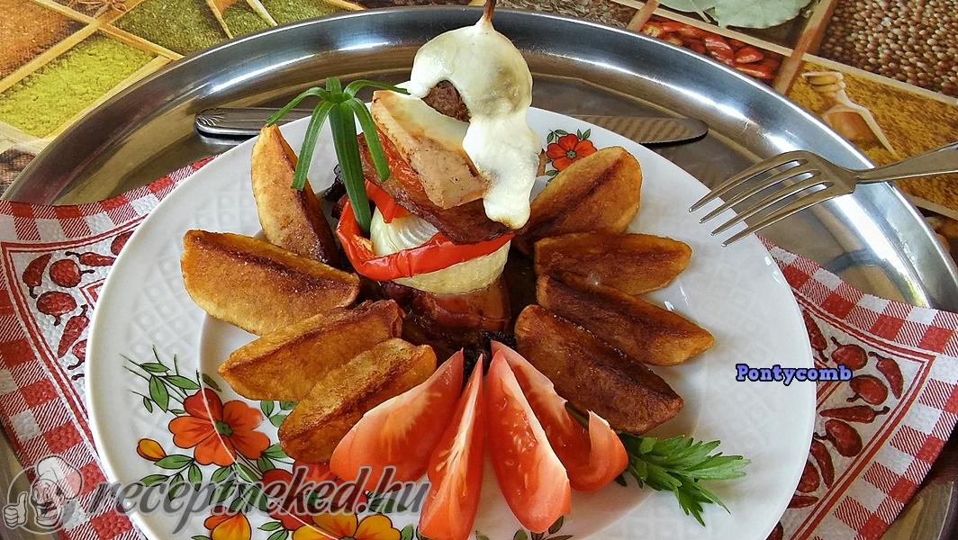 Jómagam ebben a sorrendben készítettem: tarja, füstölt szalonna, vöröshagyma, kaliforniai paprik, másik hússzelet, paradicsom, füstölt sajt, végül gomba