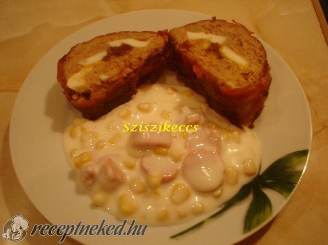 A darált húst a vízbe áztatott, majd kinyomkodott zsemlével, a tojással, a delikáttal, a pirospaprikával, a borssal és a fokhagymakrémmel alaposan összedolgozzuk. Egy őzgerincformát kibélelünk baconszeletekkel úgy, hogy az oldalát is fedjék. A massza felét belesimítjuk, majd rárétegezzük a felkarikázott főtt tojást és a kolbászt. Befedjük a maradék húsmasszával, végül a kilógó baconnel lezárjuk a tetejét. Előmelegített sütőben 170 °C-on 60 percig sütjük, majd a formából kiborítva még 20 percig pirítjuk, hogy szép piros legyen.