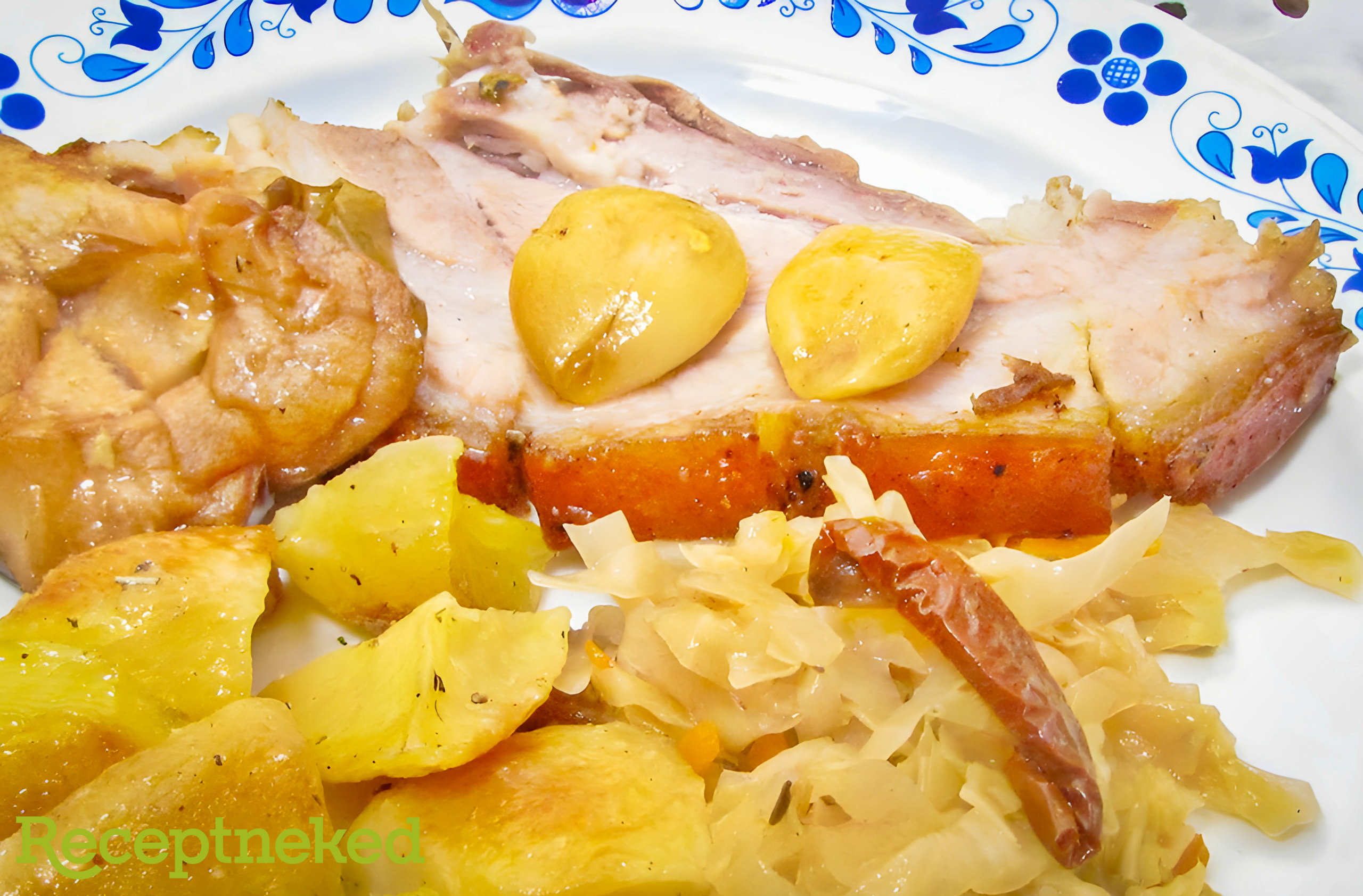 Másnap kizsírozott tepsibe rakjuk, bőrös felével felfelé, a felszeletelt vöröshagymával és a fokhagymagerezdekkel együtt. Kevés vizet öntünk alá, majd kb 170 fokon 1,5 órán keresztül sütjük alufólia alatt.