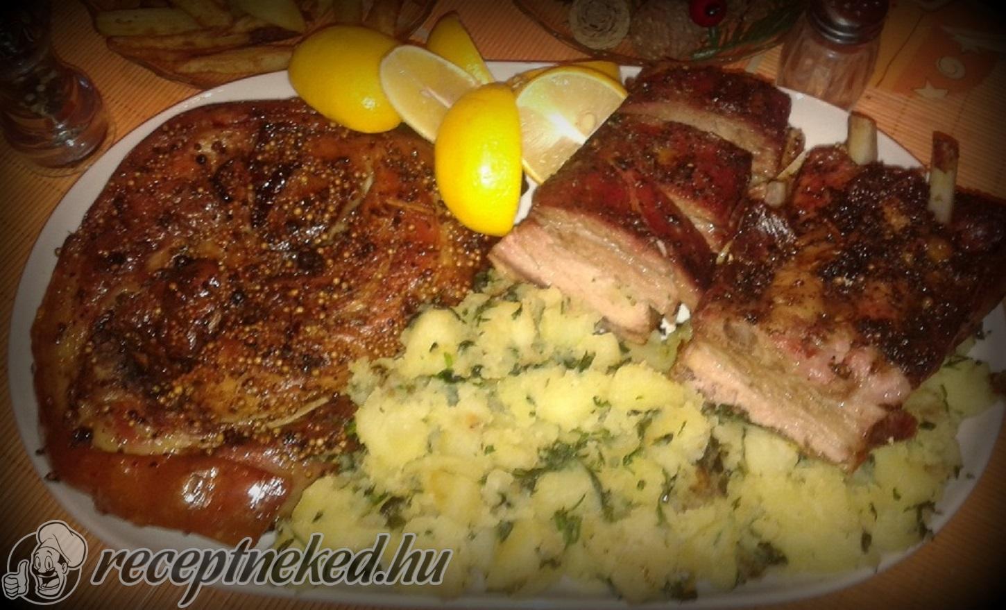A húst a bőrös oldalán keresztben és hosszában beírdaljuk, sóval, borssal, mustárral, majoránnával, kakukkfűvel jól bedörzsöljük mindenhol és lefóliázva éjszakára hűtőbe tesszük.