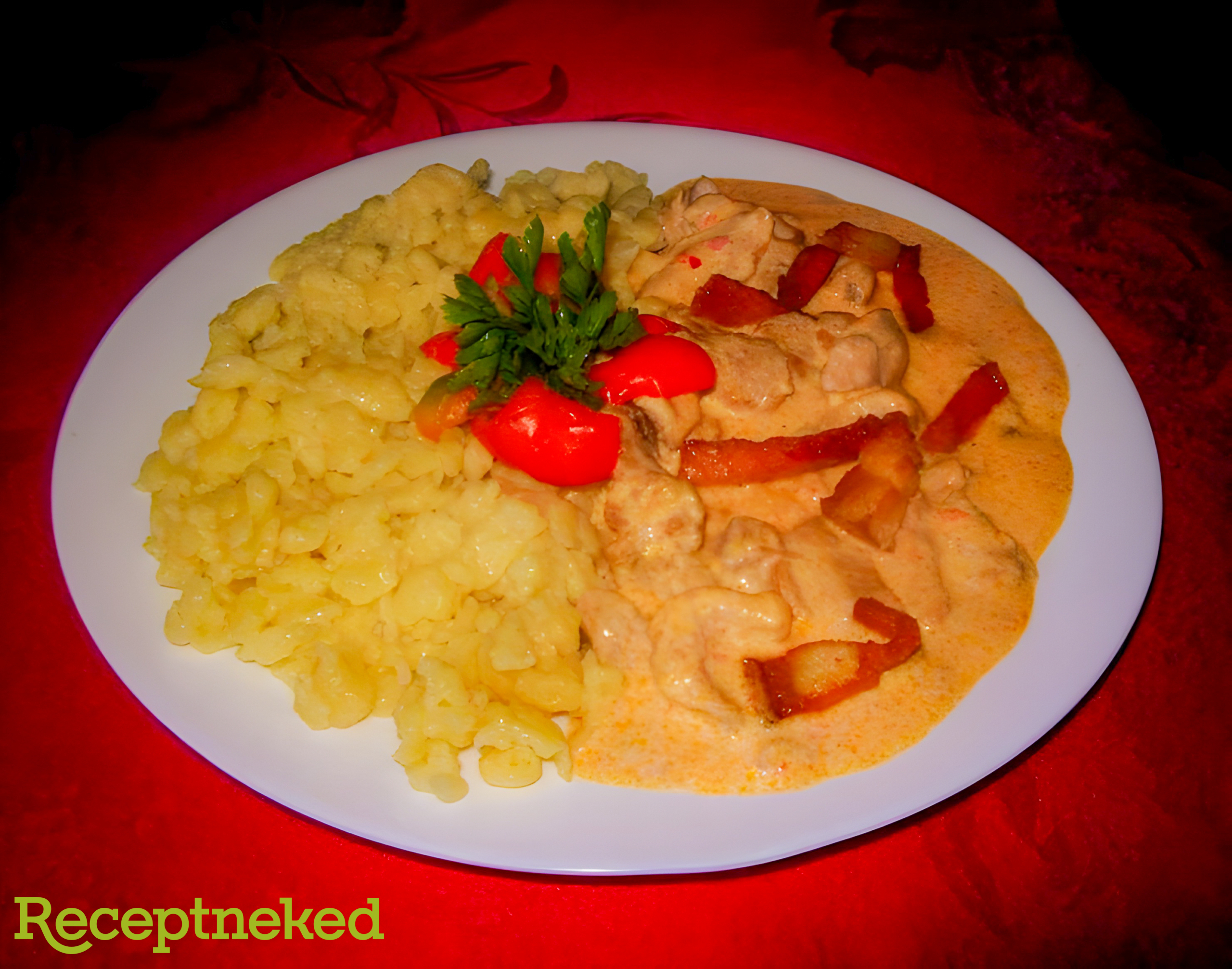 Pirospaprikát szórunk rá, kevés vízzel felöntjük, zúzott fokhagymát, sót, borsot, paradicsomot, paprikát teszünk bele. Kevés vízzel öntjük fel, hogy sűrű szaftja legyen. Amikor a hús megpuhult, a tejföllel összekevert liszttel behabarjuk és összeforraljuk.