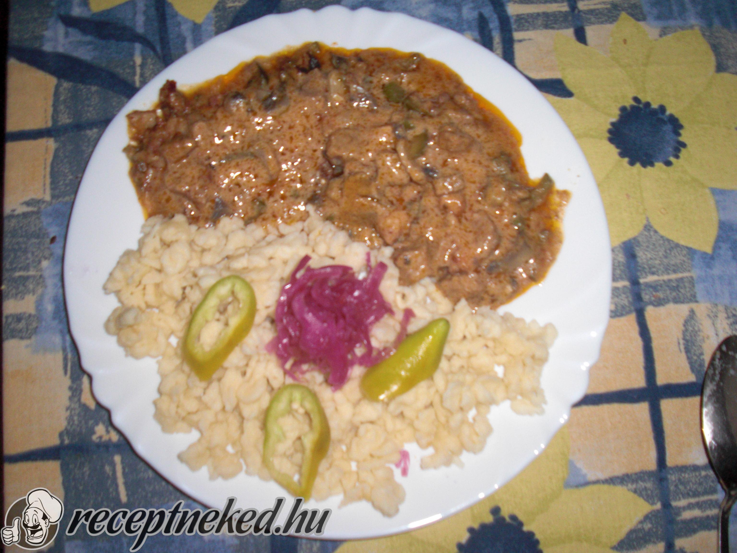 A tejfölbe belekeverjük a lisztet, hozzáöntjük a pörkölthöz és felforraljuk keverés mellett. Nokedlivel vagy tésztával tálaljuk.