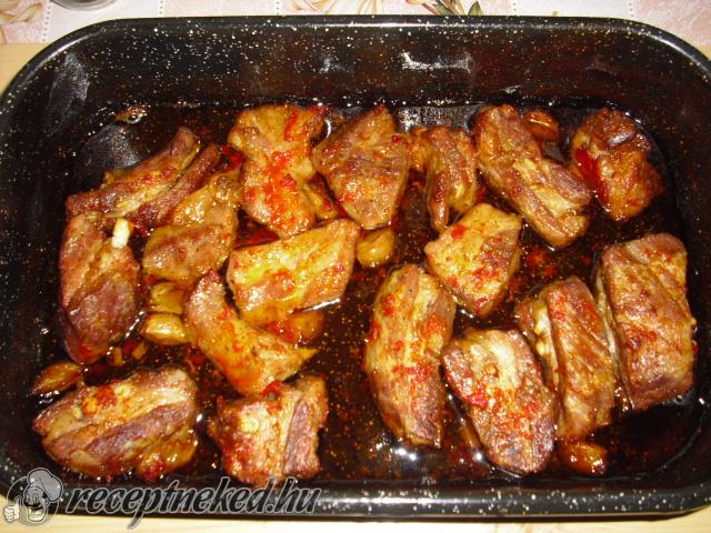 A húst daraboljuk és a fűszerekkel jól bedörzsöljük.