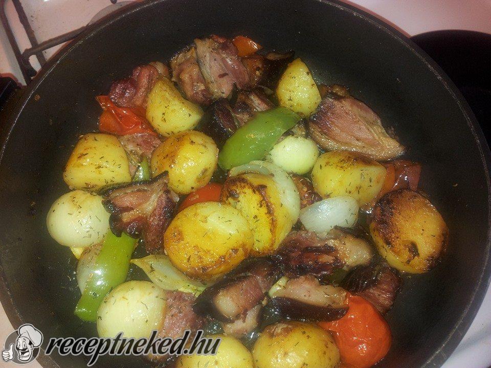 Ezután levesszük az edény fedelét, rátesszük a chilit és a paradicsomot, majd további 30-40 percig sütjük, illetve pirítjuk!