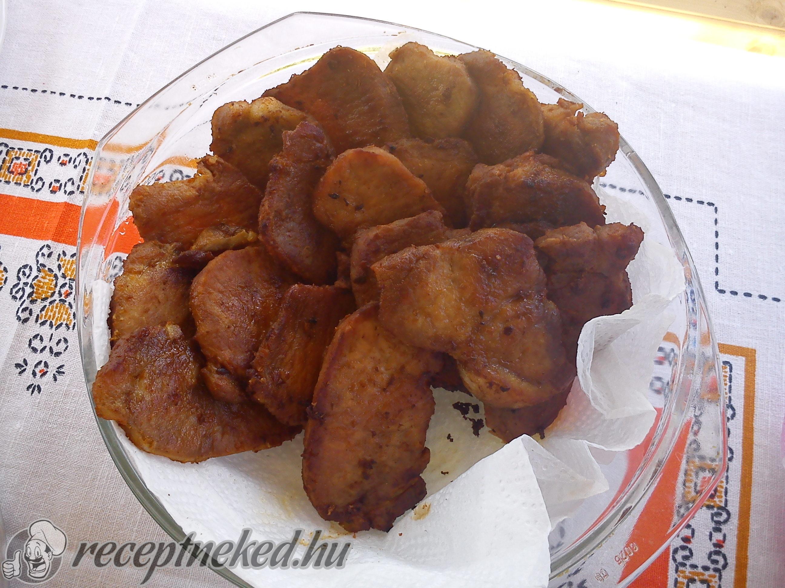 Összekeverjük a pác hozzávalóit, belerakjuk a hússzeleteket, lefedjük és egy éjszakán át a hűtőben pácoljuk. Másnap forró bő olajban, idény esetén tárcsán megsütjük. Burgonyapürével, petrezselymes burgonyával, kukoricásrizzsel vagy salátával is tálalhatjuk.