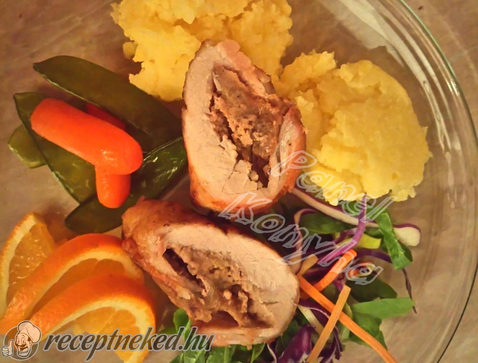 A gesztenyemasszát elosztjuk a húsok mennyiségével arányosan. Beletöltjük a húsokba és feltekerjük.