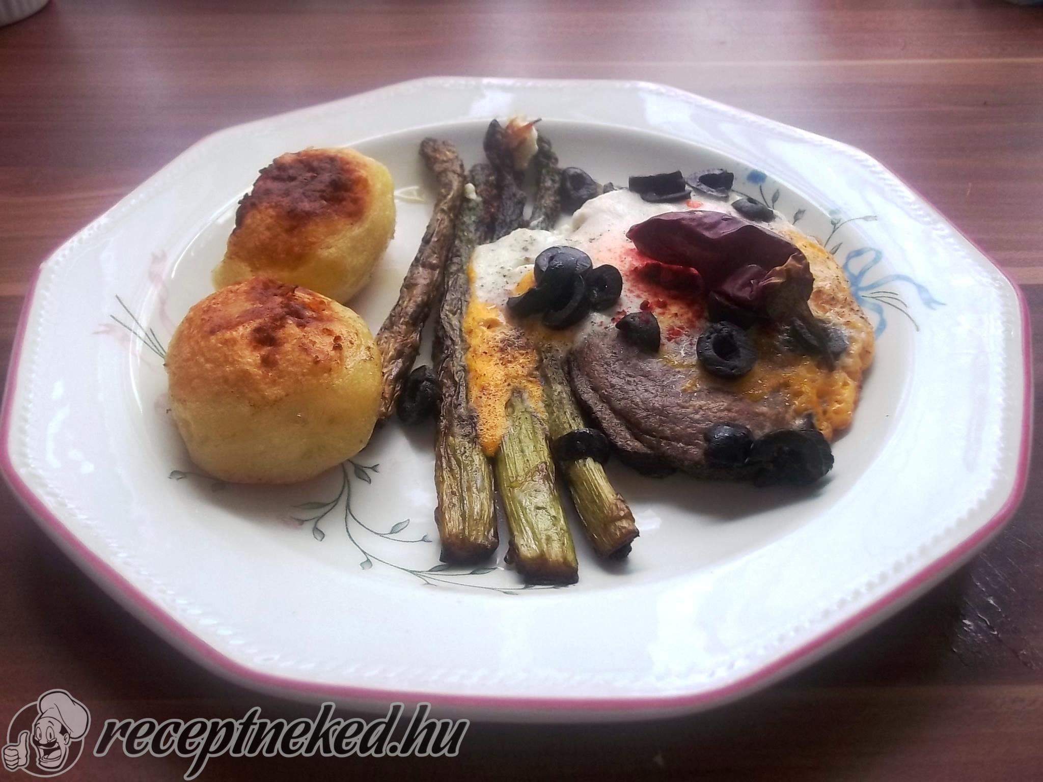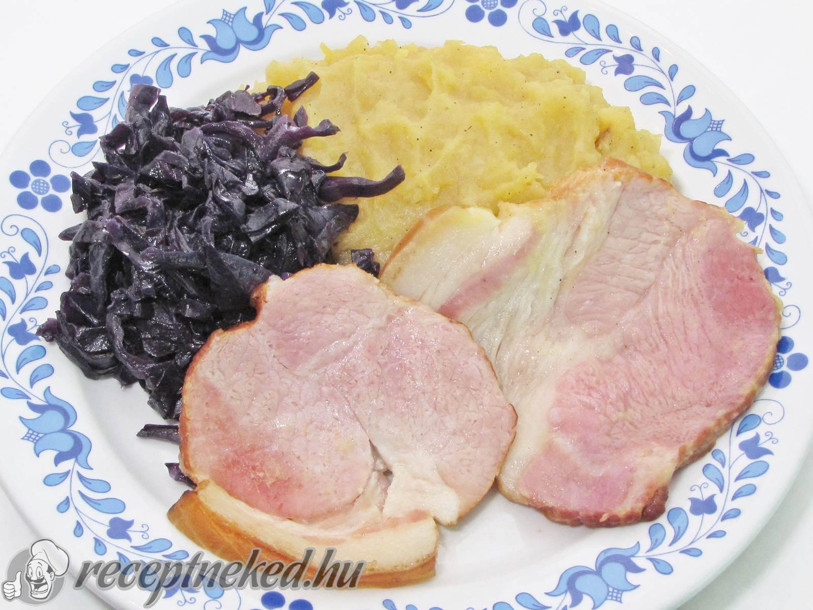 A sült csülköt a sült hagymával, kaliforniai paprikával és kígyóuborkával tálaljuk.