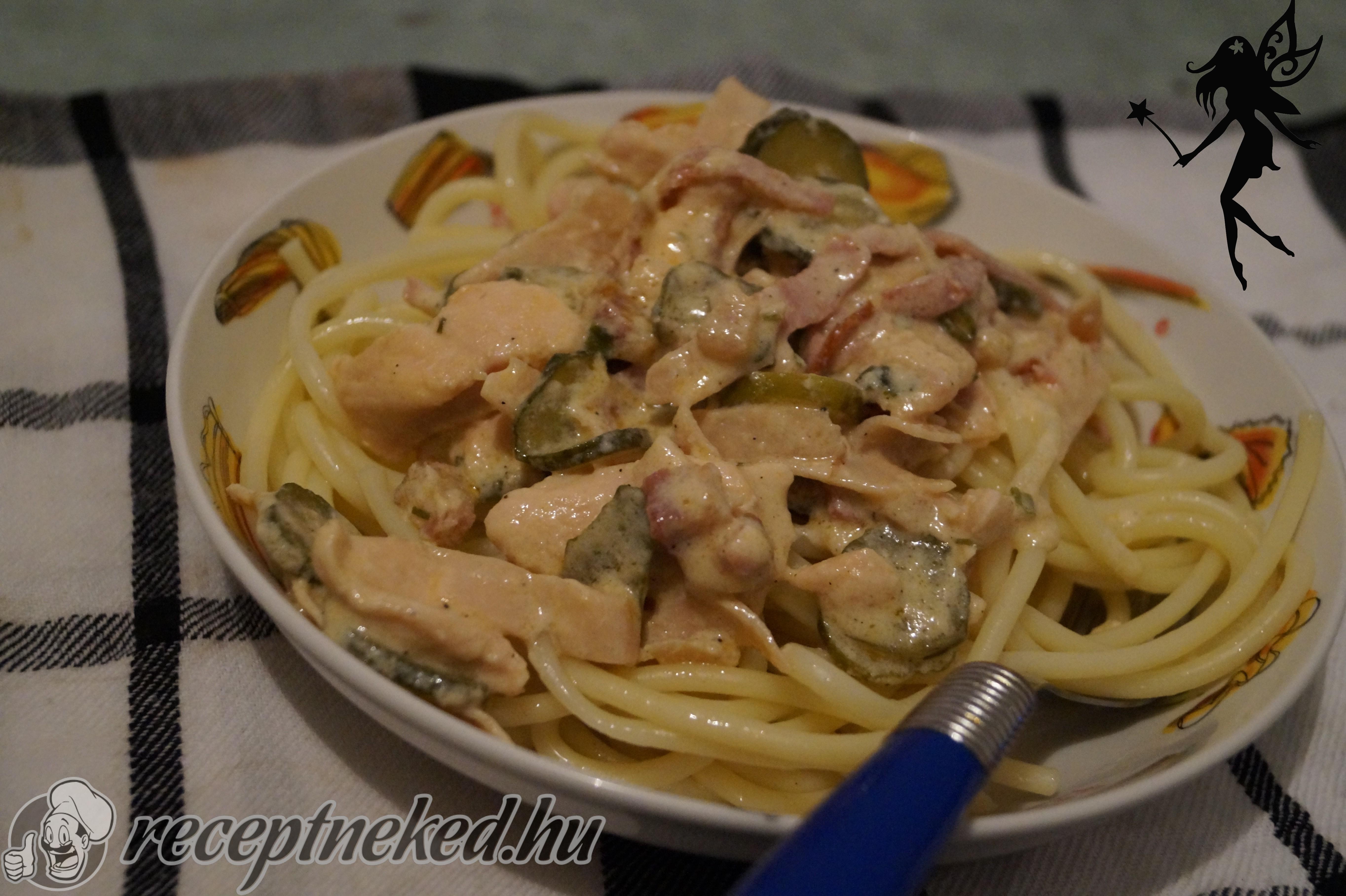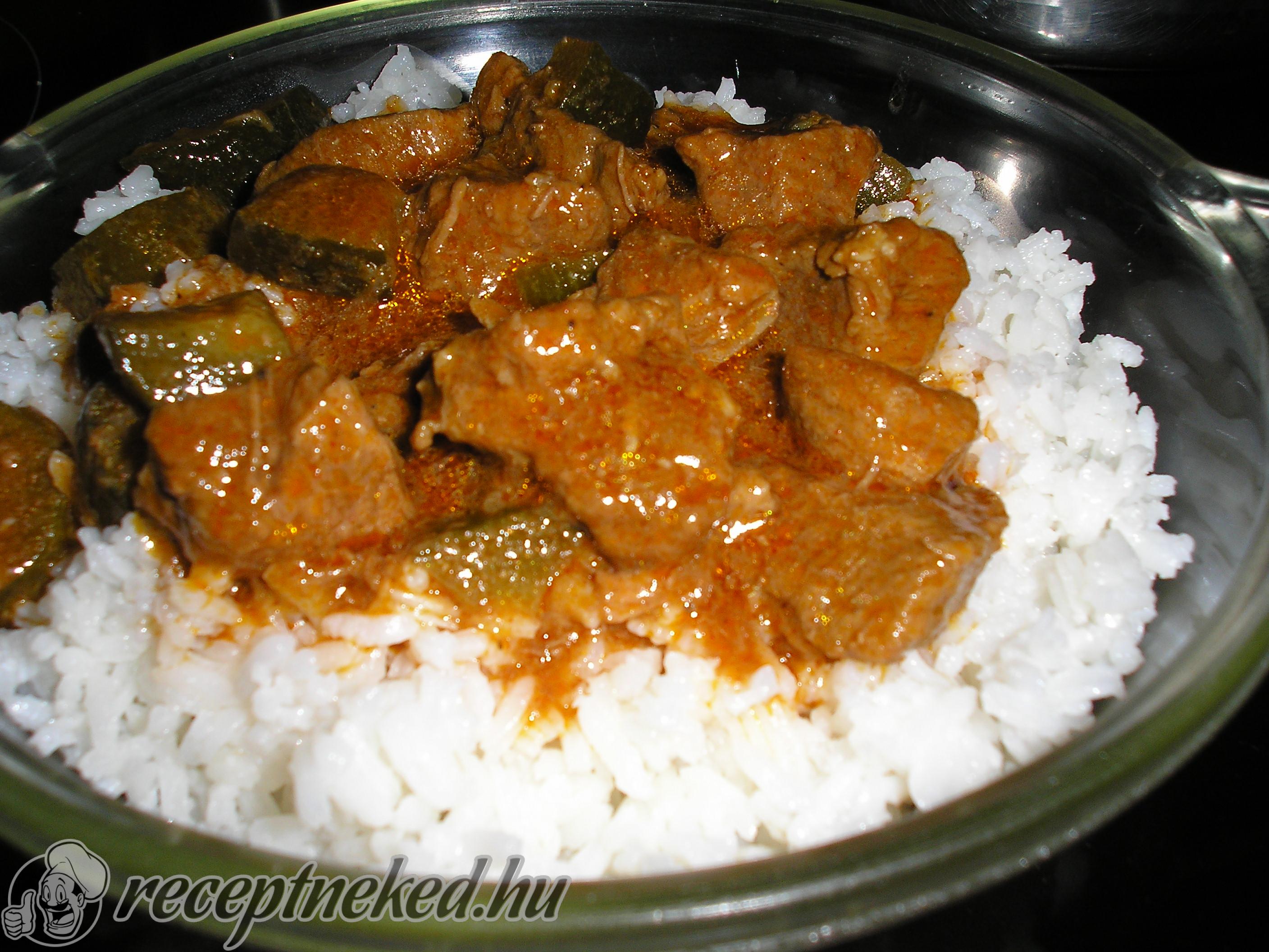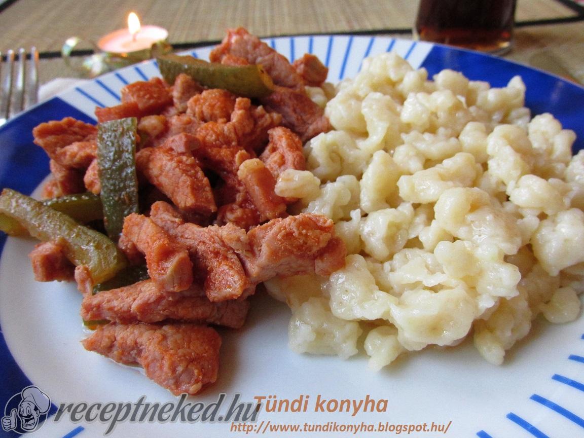 Mikor már a hús félig megfőtt, hozzáadjuk a csíkozott lecsókolbászt és a csíkozott uborkát. Azt ételhez egy csipet pirospaprikát adunk és addig főzzük, ameddig a hús puha nem lesz.